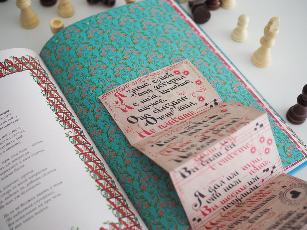 А еще внутри книги — съемная карта Зазеркалья с размеченными «ходами» персонажей, свиток с «доказательствами» похищения кренделей и знаменитое стихотворение «Бармаглот» на тонкой кальке.