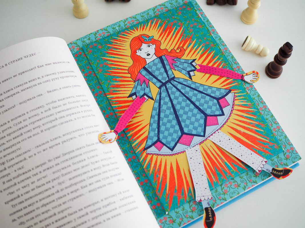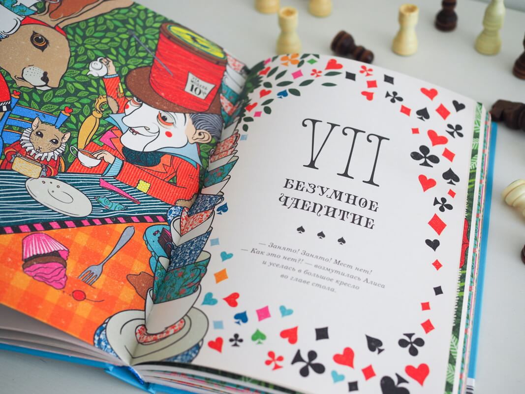 В этой книге обе сказки: «Алиса в Стране Чудес» и «Алиса в Зазеркалье» в полном классическом переводе Нины Михайловны Демуровой с цветными иллюстрациями, созданными студией MinaLima. Основали студию Мирафора Мина и Эдуардо Лима, известные в первую очередь тем, что разрабатывали реквизит для всех фильмов о Гарри Поттере («Карту мародеров» мы знаем именно такой как раз благодаря Мирафоре Мине). Сегодня Мина и Лима создают иллюстрации для книг — необычные, яркие и совершенно уникальные.