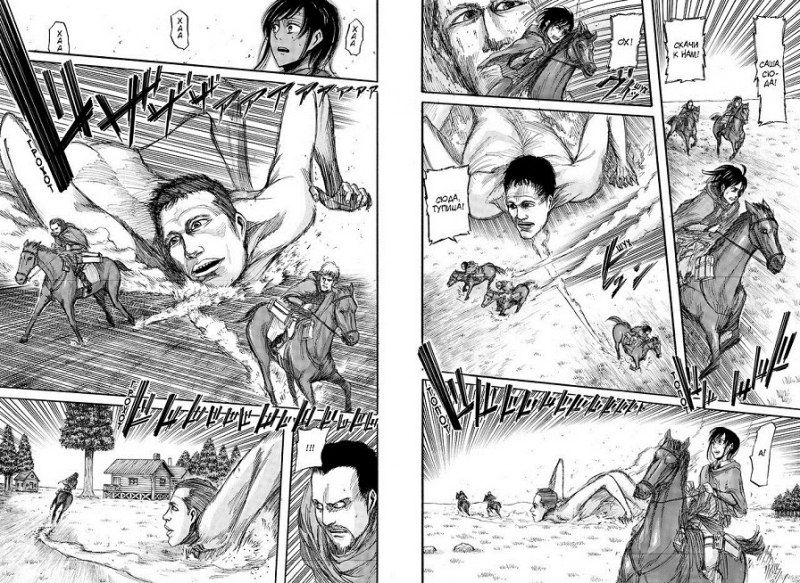 В экспедиции участвуют и верные друзья Эрена, Армин и Микаса. Сначала все идет более или менее гладко, но внезапно появляется невероятно быстрая женщина-титан и атакует отряд...