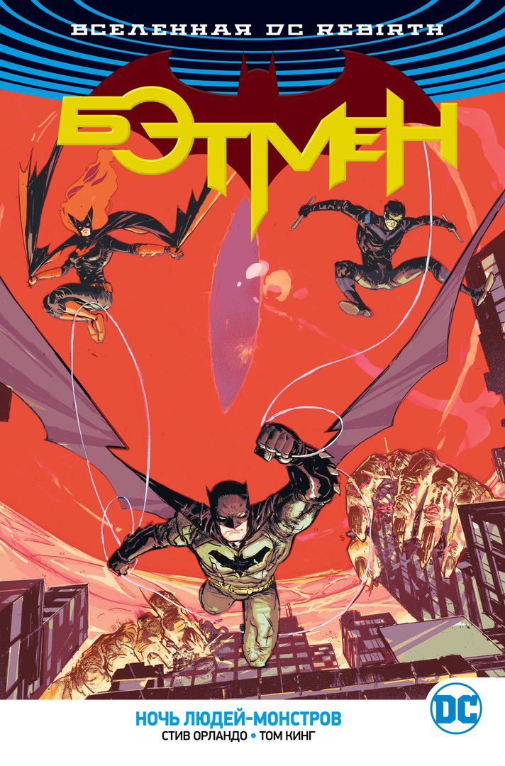 Комикс из линейки перезапуска Rebith «Ночь Людей-Монстров» - это масштабный кроссовер сразу трех топовых серий DC от лучших авторов издательства: Стива Орландо, Тома Кинга, Тима Сили, Джеймса Тиниона IV и других. В сборник вошли выпуски «Бэтмен» с 7 по 8, «Найтвинг» с 5 по 6, и «Детективные комиксы» с 941 по 942.