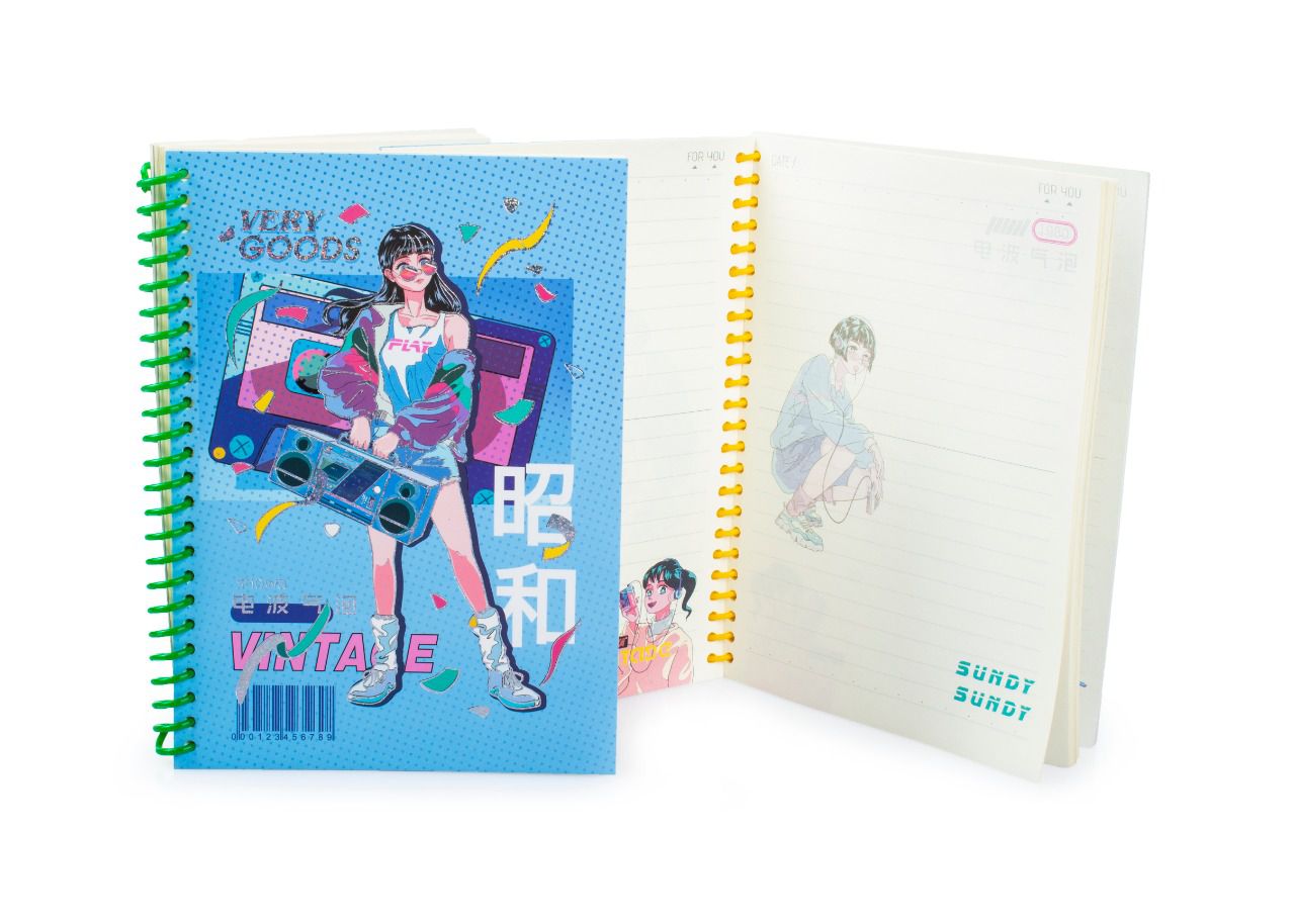 Блокнот на кольцах с девочкой и магнитофоном, нарисованных в аниме-стиле с блестками :)