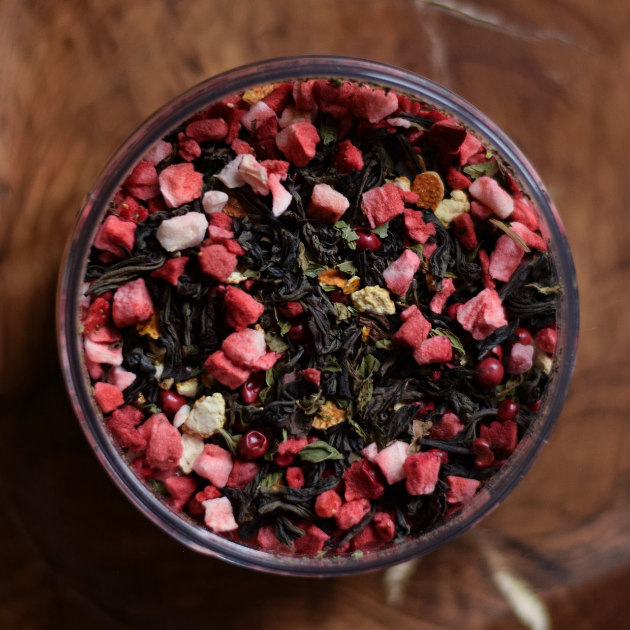 - Состав: чёрный чай (ассам), цедра апельсина, розовый перец, клубника, мята