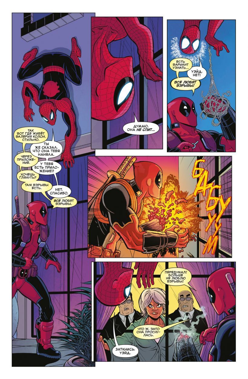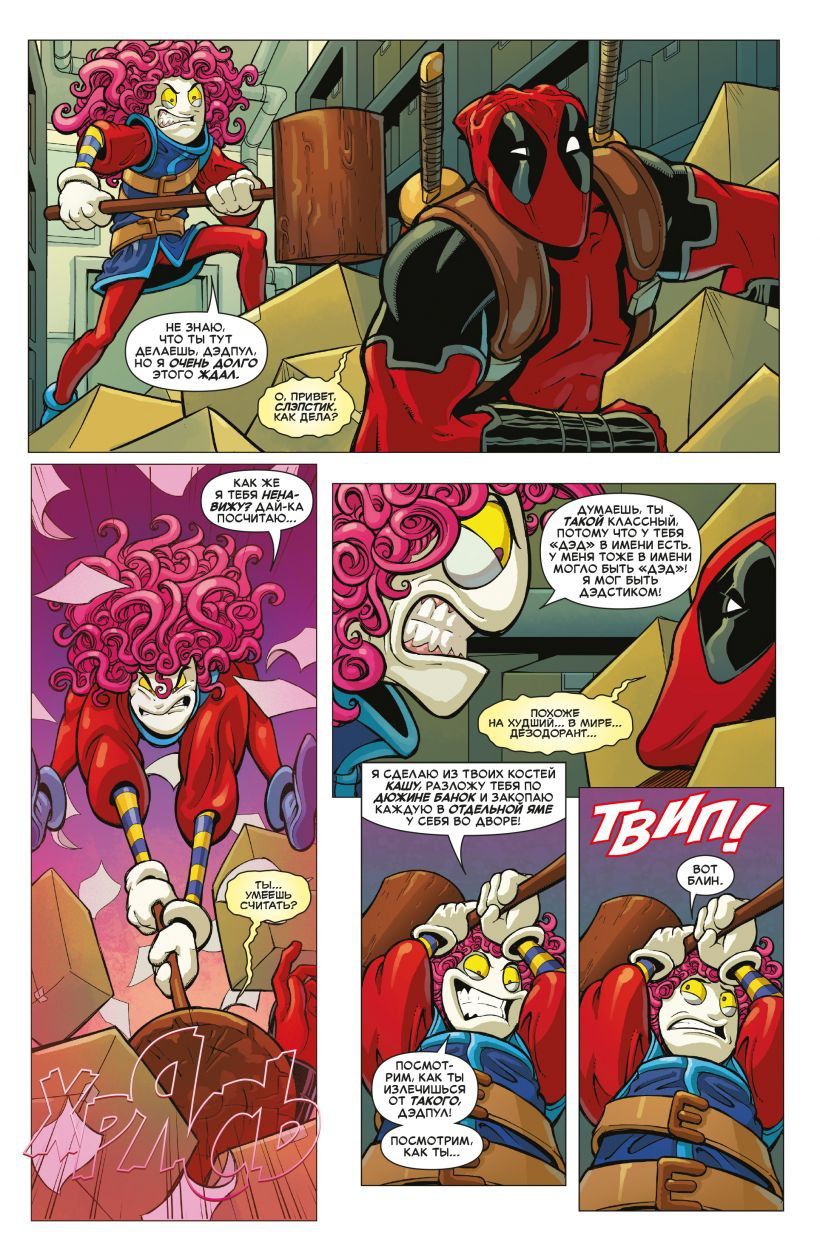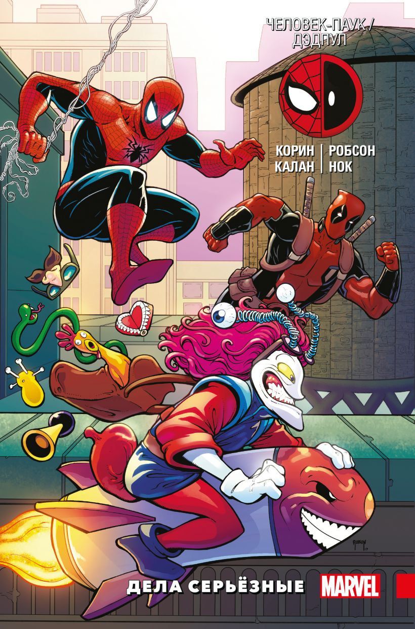 Никто так не разбирается в слэпстике, как Паучок и Дэдпул! Разве что, может... СЛЭПСТИК? Но ходячая мультяшка не в тему, ведь он объявился именно в тот момент, когда болтливый наёмник и паутинное чудо решили: больше никаких шуток! Но что могло подтолкнуть их убрать веселье из их книжки с картинками? И сможет ли стенолаз сдержать своё обещание относиться к супергеройству серьёзнее, параллельно разбираясь с выходками Слэпстика? Затем, когда злодей Аркада решает построить новый, ещё более беспощадный Мир убийств в Мадрипуре, он приглашает (под этим мы понимаем "похищает") Человека-паука стать его первым гостем! В сборник вошли выпуски комикса "Человек-паук / Дэдпул" #19—22 Джошуа Корина, Эллиотта Калана, Уилла Робсона, Скотта Ханны, Тодда Нока, Джордана Бойда и Рэйчел Розенберг.