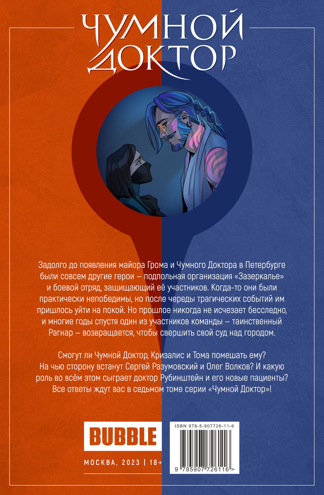 Задолго до появления майора Грома и Чумного Доктора в Петербурге были совсем другие герои – подпольная организация «Зазеркалье» и боевой отряд, защищающий её участников. Когда-то они были практически непобедимы, но после череды трагических событий им пришлось уйти на покой. Но прошлое никогда не исчезает бесследно, и многие годы спустя один из участников команды – таинственный Рагнар – возвращается, чтобы свершить свой суд над городом. Смогут ли Чумной Доктор, Кризалис и Тома помешать ему? На чью сторону встанут Сергей Разумовский и Олег Волков? И какую роль во всём этом сыграет доктор Рубинштейн и его новые пациенты? Все ответы ждут вас в седьмом томе серии «Чумной Доктор»!