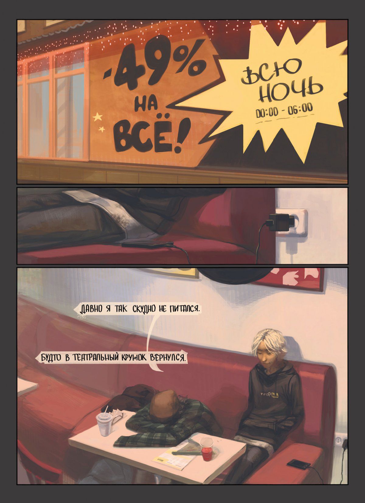 В заключительной части «Дёшево и сердито» Дид и Модест отправляются в дальнейшее плавание по волнам судьбы – ведь вместе скитаться по просторам куда легче. Друзьям предстоит в полной мере познать тяготы бродячей жизни, но даже в такой дороге воздух кажется чище, чем в душной бетонной коробке. Новые откровения о прежней жизни, песни под гитару в подземке, судьбоносная встреча в заброшенном доме – всё это в последнем томе «Дёшево и сердито».