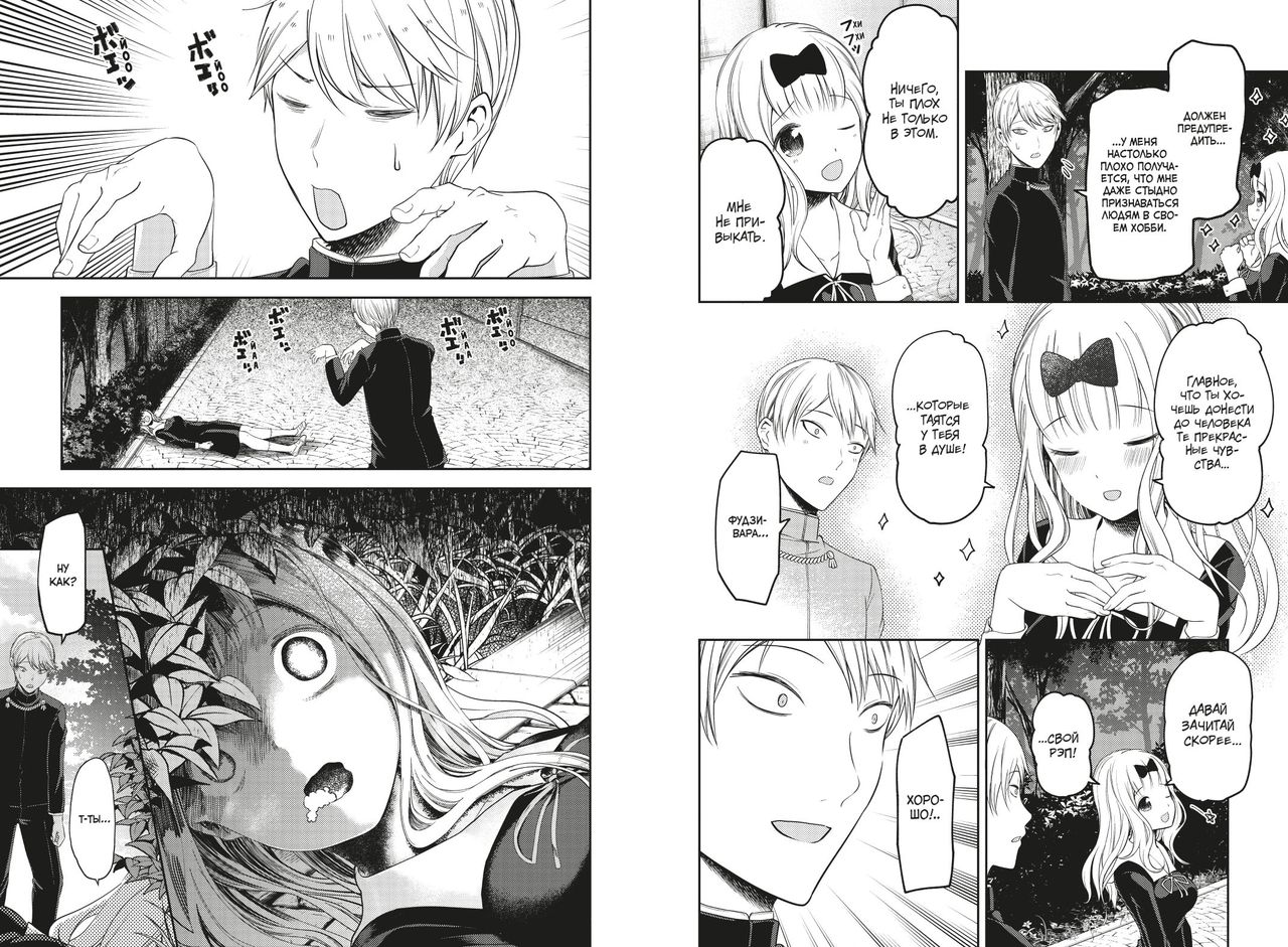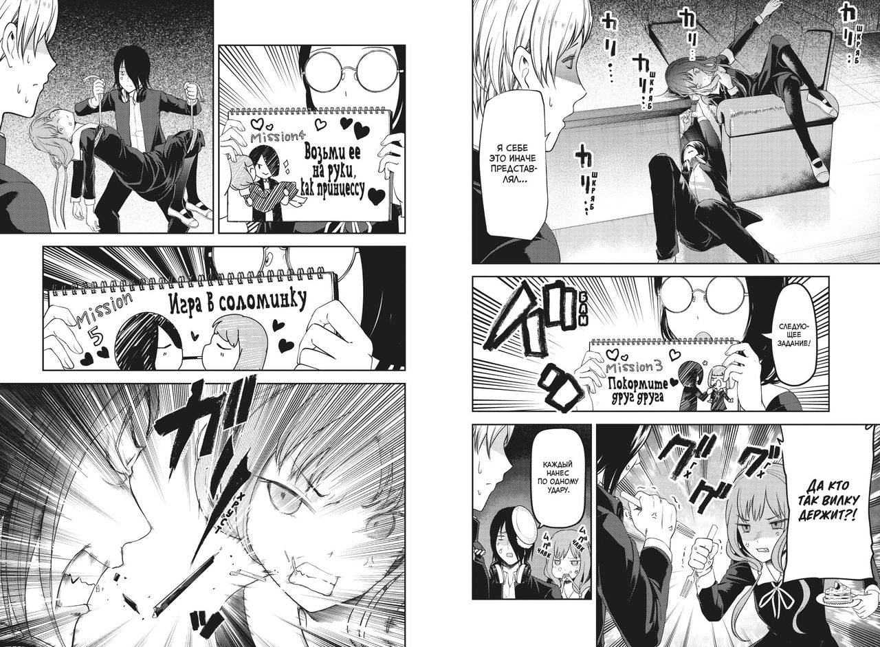 Чем дальше развивается история тщательно отрицаемых отношений между Миюки и Кагуей, тем сильнее в ней романтические вайбы, порой переходящие все границы. Из-за этого ситуации, в которые попадают герои, становятся уморительно смешными. В шестой книге Синомия и Сироганэ, а также Хаясака, Исигами, Иино, Фудзивара (и не только) продолжают раскрывать читателям (и друг другу) порой весьма неожиданные стороны своих натур.