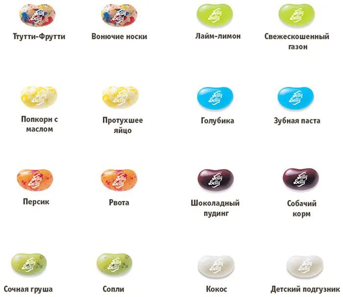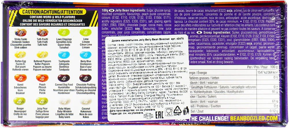 Набор содержит конфетки со "странными вкусами": собачьего корма, вонючих носков, скошенной травы, детских подгузников, тухлого яйца, зубной пасты, рвоты и соплей. Такое драже станет превосходным подарком-розыгрышем для ваших друзей. Сыграйте в веселую игру - вращайте барабан и посмотрите, какой цвет вам выпал, а затем съешьте конфету указанного цвета. "Вкусные" и "странные" конфетки имеют одинаковый цвет. Тутти-фрутти или вонючие носки? Лайм или скошенная трава? Попкорн с маслом или тухлое яйцо? Голубика или зубная паста? Персик или рвота? Шоколадный пудинг или собачий корм? Сочная груша или сопли? Кокос или детские подгузники? Сравните эти невероятные и странные вкусы и разыграйте своих друзей!