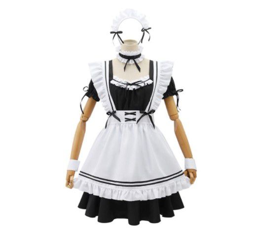 В комплекте платье, фартук, ободок, повязка-бабочка, повязки на запястья, подвязка на ногу.
