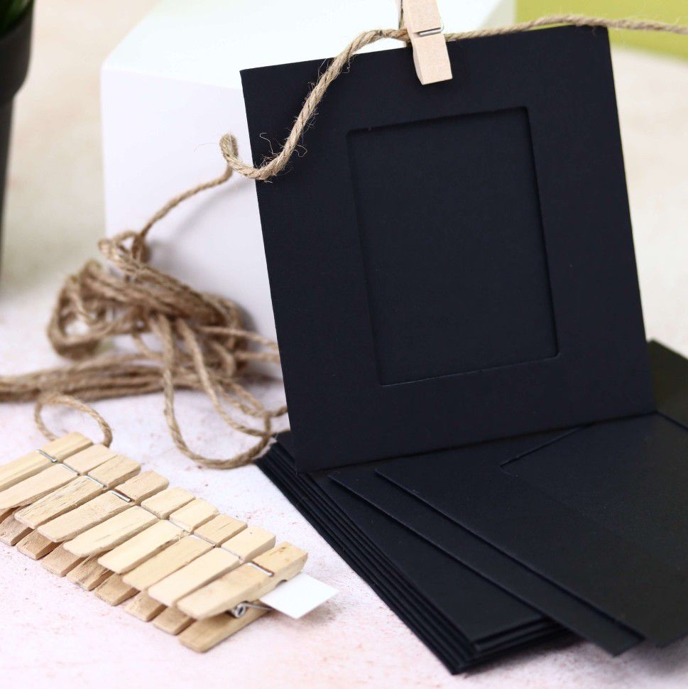 Набор из 10 черных фоторамок с прищепками и джутом-бичёвкой в комплекте! Хороший способ вывесить фотографии с Instax а также распечатанные на обычном принтере. Так как плотный картон у фоторамки не даст уголкам фотографии начать загинаться со временем