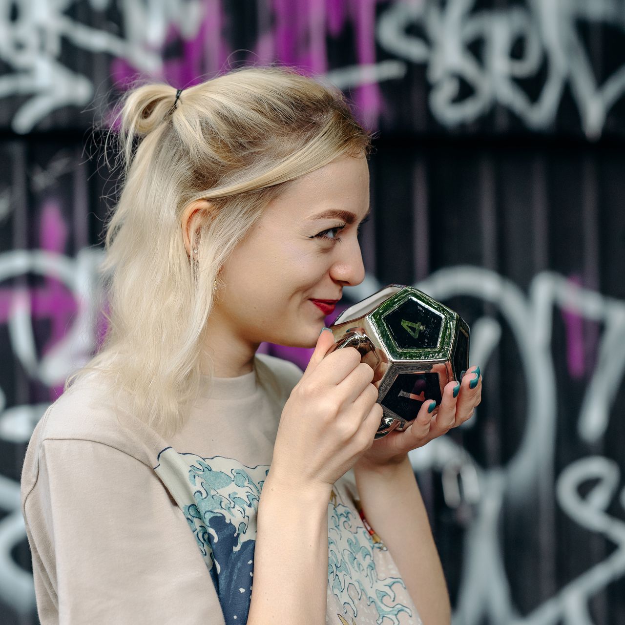 Керамическая кружка создана на основе 12-гранных кубиков. На нем изображен символ амперсанда Dungeons and Dragons, который выглядит как зацикленный дракон, выдыхающий огонь.