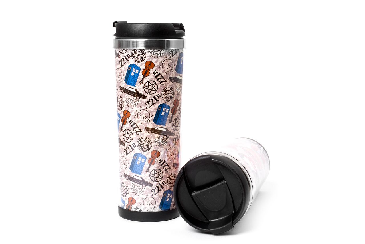 Термокружка с символами популярных фэндомов: Сверхъестественное, Шерлок, Доктор Кто. Кружка сохраняет тепло на протяжении 3-5 часов благодаря двойной стенке.