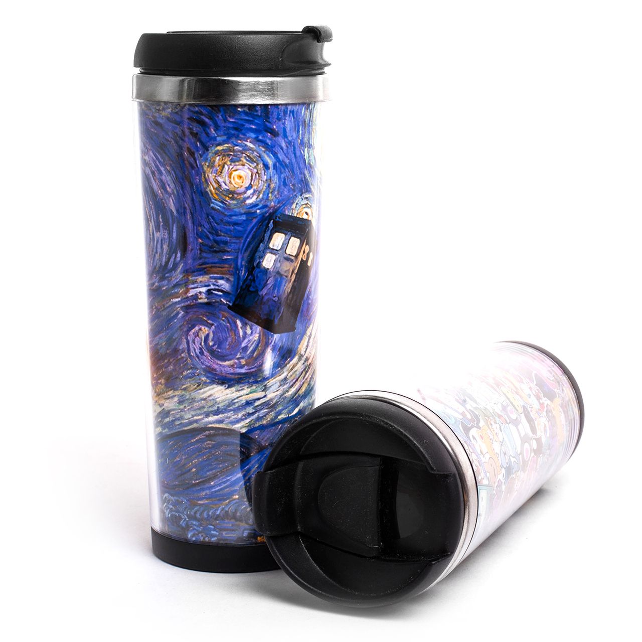 Кружка-термос имеет двойную стенку с воздушной прослойкой. Её внешняя поверхность не обожжет вам рук, сможете держать без опаски. Данный тамблер сохраняет тепло до 5-ти часов! В отличие от классического термоса, к ней не потребуется дополнительная емкость для питья. Стильный дизайн с репродукцией картины Ван Гога "Звездная ночь" и будки "Тардис" для ценителей живописи и поклонников вселенной "Доктор Кто".