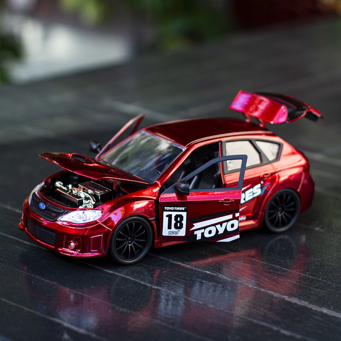Редкая металлическая модель хэтча Subaru WRX STI 2012 года. Эта версия выполнена в красном цвете кузова. Двери, капот и багажник открываются. Колеса сделаны из настоящей резины. Все выполнено на высоком уровне. Редкая серия моделей авто JDM Tuners