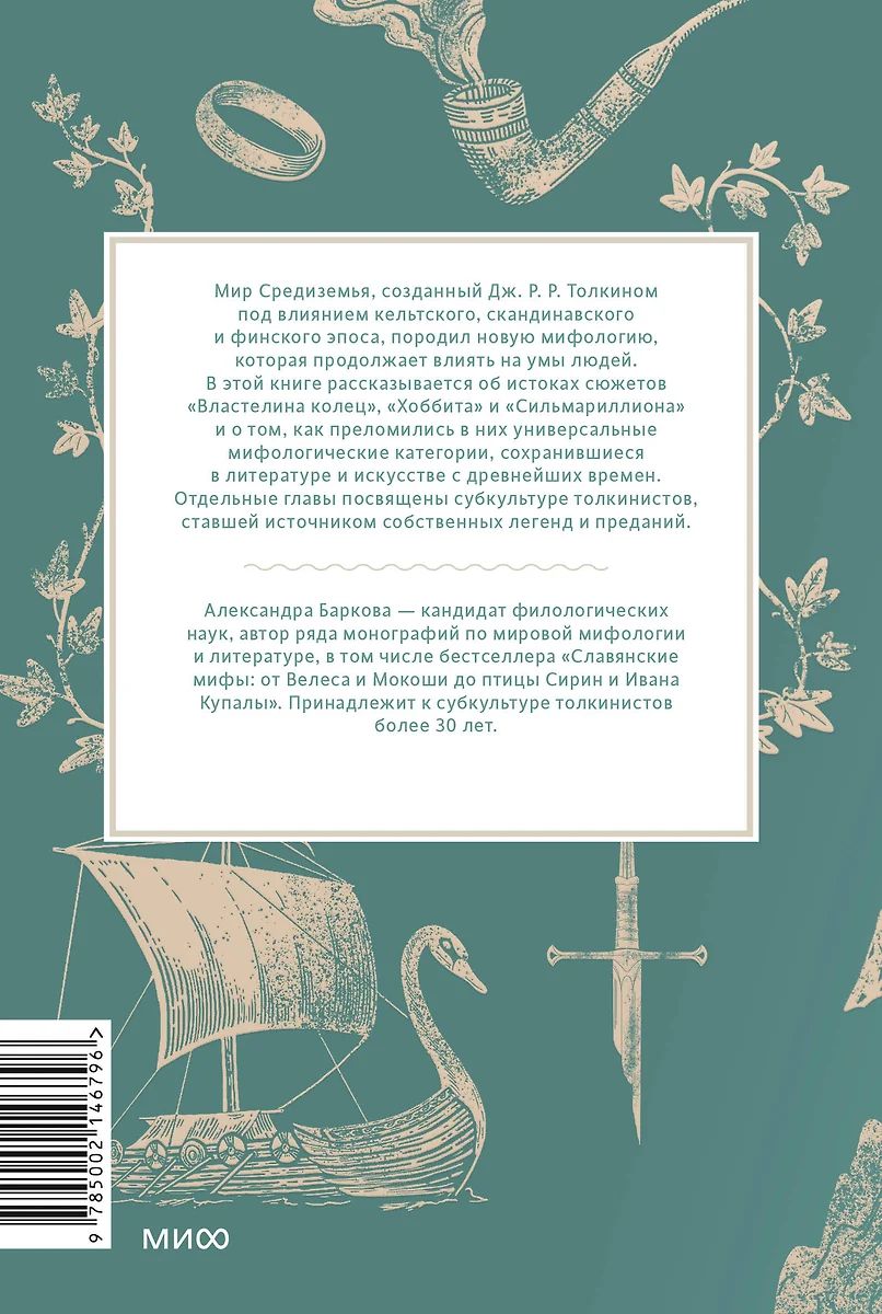 Мир Средиземья, созданный Дж. Р. Р. Толкиным под влиянием кельтского, скандинавского и финского эпоса, породил новую мифологию, которая, в свою очередь, изменила мировую культуру. В этой книге фольклорист и преданный Толкинист Александра Баркова рассказывает об истоках сюжетов «Властелина колец», «Хоббита» и «Сильмариллиона» и о том как преломились в них универсальные мифологические категории, сохранившиеся в мышлении человечества с древнейших времен. Отдельная глава посвящена субкультуре толкинистов, ставшей источником собственных легенд и преданий.