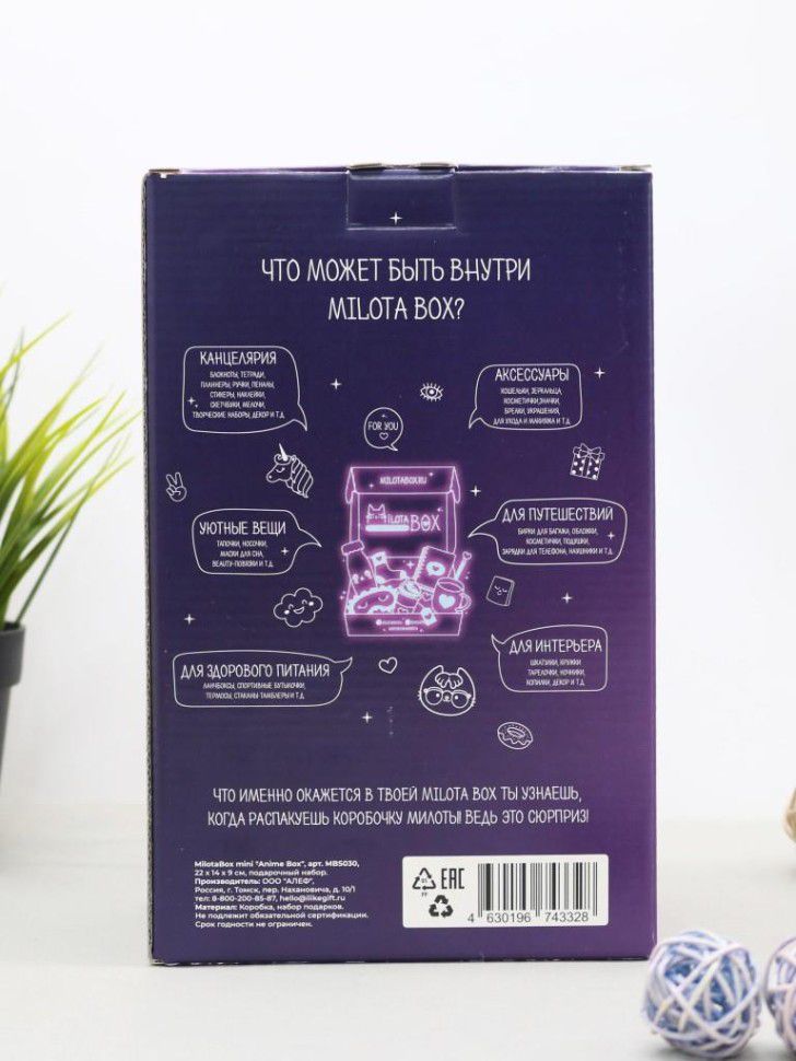 Каждая коробочка милоты наполнена необычными вещицами, которыми будет приятно пользоваться в повседневной жизни: милая канцелярия, уютные товары для дома, стильные аксессуары, предметы для здорового образа жизни и приятные мелочи. Внутри Milota BOX находится до 8 сюрпризов, упакованных в стилизованную подарочную бумагу тишью. Коробочка из плотного, дизайнерского картона.