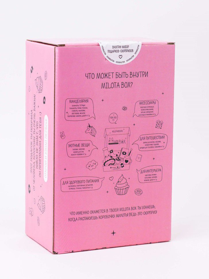 Каждая коробочка милоты наполнена необычными вещицами, которыми будет приятно пользоваться в повседневной жизни: милая канцелярия, уютные товары для дома, стильные аксессуары, предметы для здорового образа жизни и приятные мелочи. Внутри Milota BOX находится до 8 сюрпризов, упакованных в стилизованную подарочную бумагу тишью. Коробочка из плотного, дизайнерского картона.
