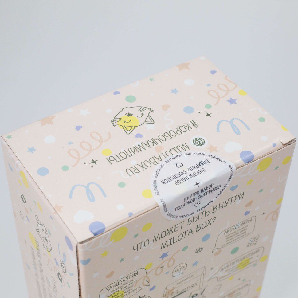 Каждая коробочка милоты наполнена необычными вещицами, которыми будет приятно пользоваться в повседневной жизни: милая канцелярия, уютные товары для дома, стильные аксессуары, предметы для здорового образа жизни и приятные мелочи. Внутри Milota BOX находится до 8 сюрпризов, упакованных в стилизованную подарочную бумагу тишью. Коробочка из плотного, дизайнерского картона.