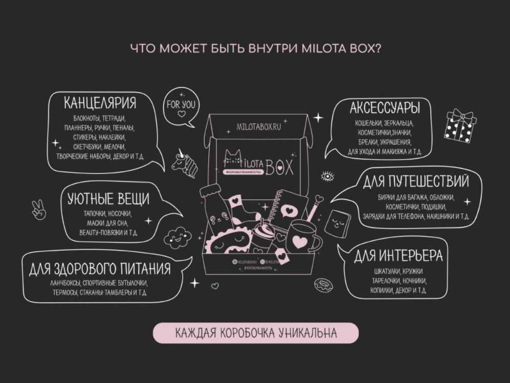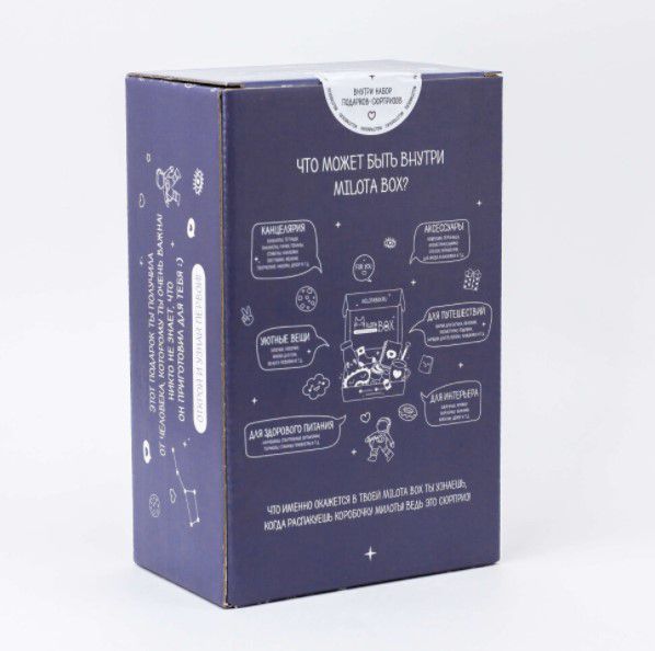 Каждая коробочка милоты наполнена необычными вещицами, которыми будет приятно пользоваться в повседневной жизни: милая канцелярия, уютные товары для дома, стильные аксессуары, предметы для здорового образа жизни и приятные мелочи. Внутри Milota BOX находится от 5 до 8 сюрпризов, упакованных в стилизованную подарочную бумагу! Коробочка из плотного, дизайнерского картона.