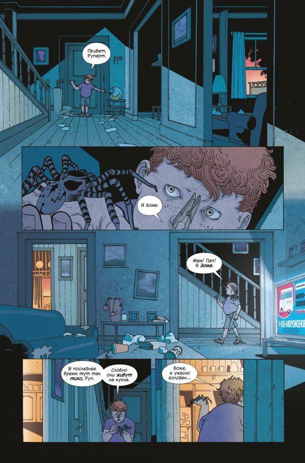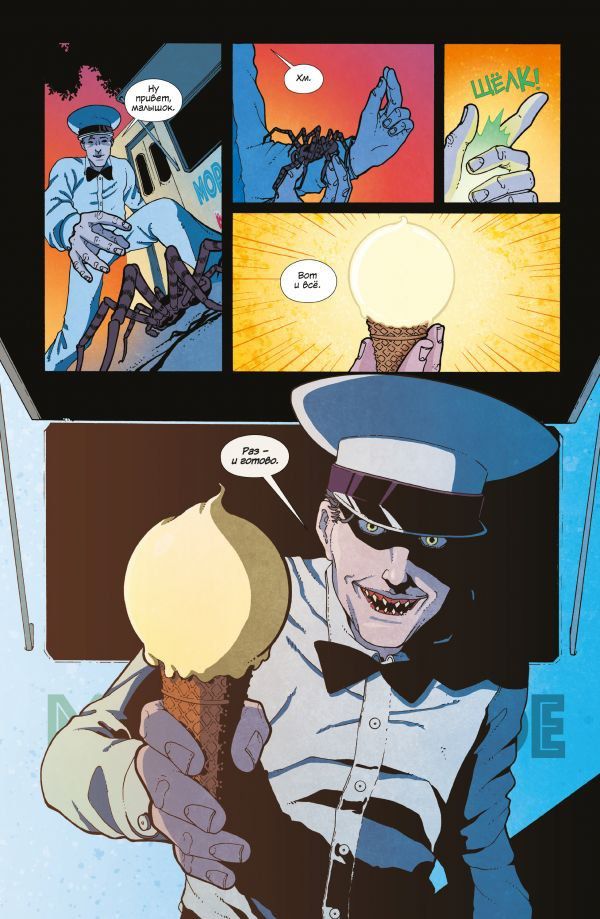 Шоколадный, ванильный, экзистенциальный ужас... Для любого несчастья есть свой вкус. "Мороженщик" — эталонная серия в жанре рассказов о горести, чуде и спасении. Каждая история знакомит нас с разными странными персонажами, копающимися в своей приторной порции страданий. И где-то на окраине всех этих событий, словно весёленькая музыка его яркого фургончика, стоит Мороженщик... ткач историй, продавец вкусностей. Друг. Враг. Бог. Демон. Человек, который щёлкает пальцами: раз — и готово. Теперь ваша жизнь изменится навсегда. ""Мороженщик" — отличный пример современной антологии ужасов. Это глоток свежего воздуха в подзастоявшейся комикс-индустрии. Авторская команда не придерживается каких-то рамок — они их перескакивают, гнут и ломают, вынуждая нас задаваться вопросом: чего ждать дальше?"