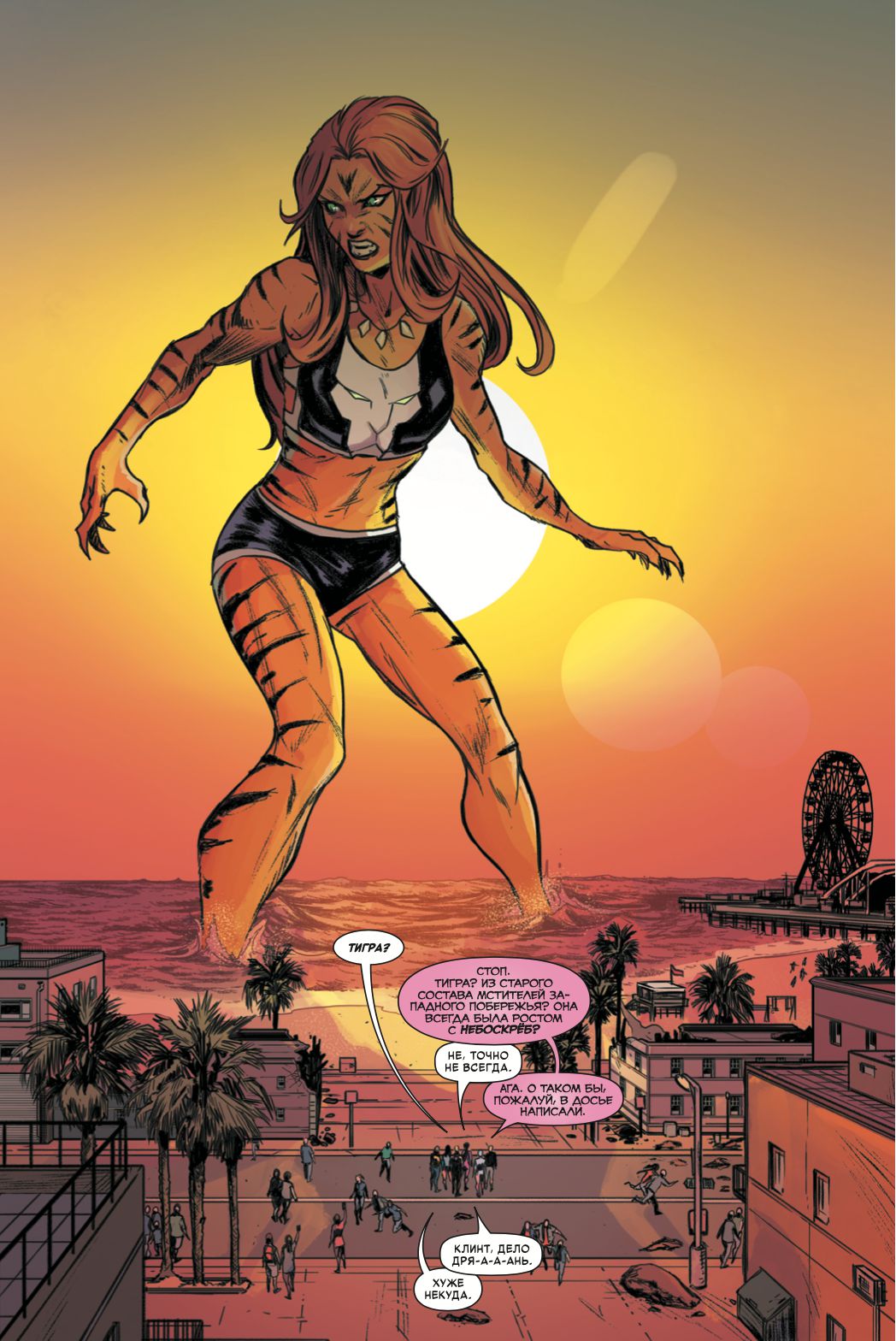 ГРЯДЁТ НОВАЯ ЭРА в истории величайших героев Тихоокеанского побережья! Встречайте: Хоукай (ваша любимая Кейт Бишоп!), второй Хоукай (Клинт Бартон!), Америка Чавес, Кид Омега (Квентин Квайр!), Гвенпул (Гвендолин Пул!) и парень по прозвищу Сплав (кто?)! Всё верно: они — новые Мстители Западного побережья!