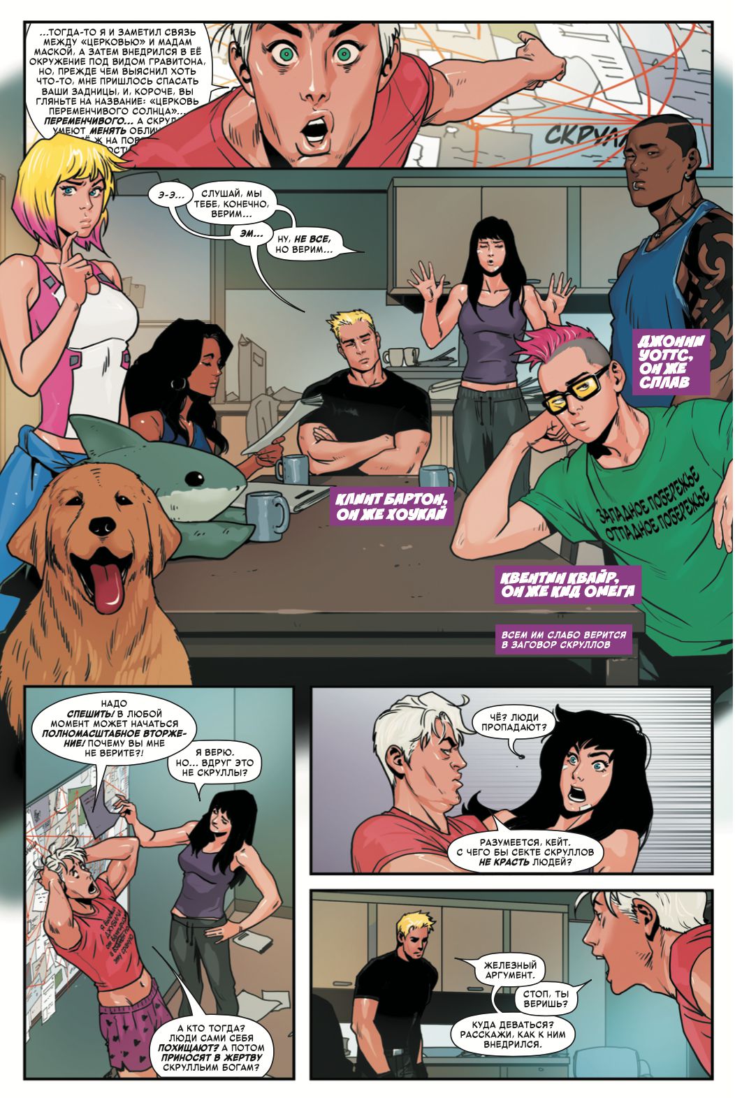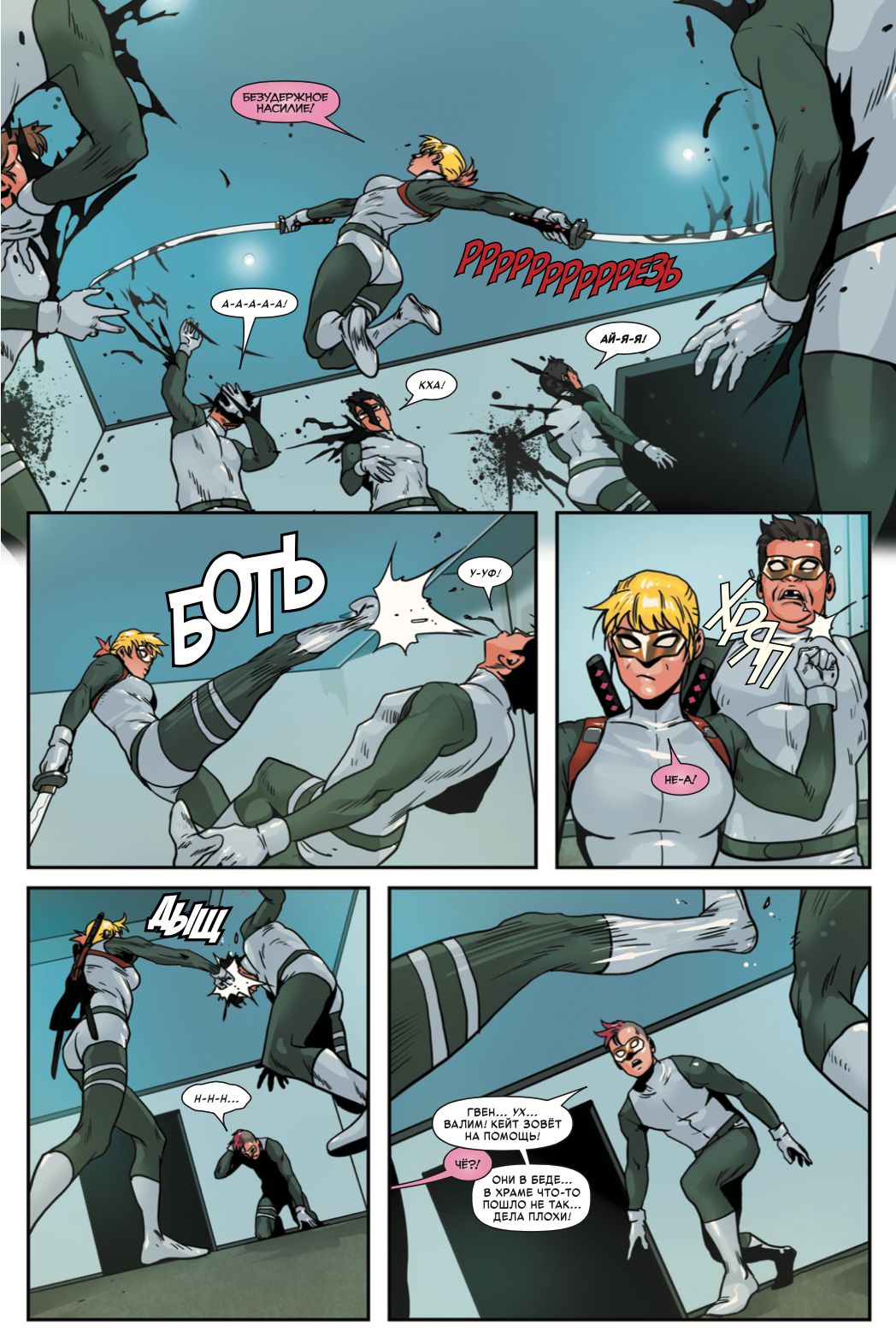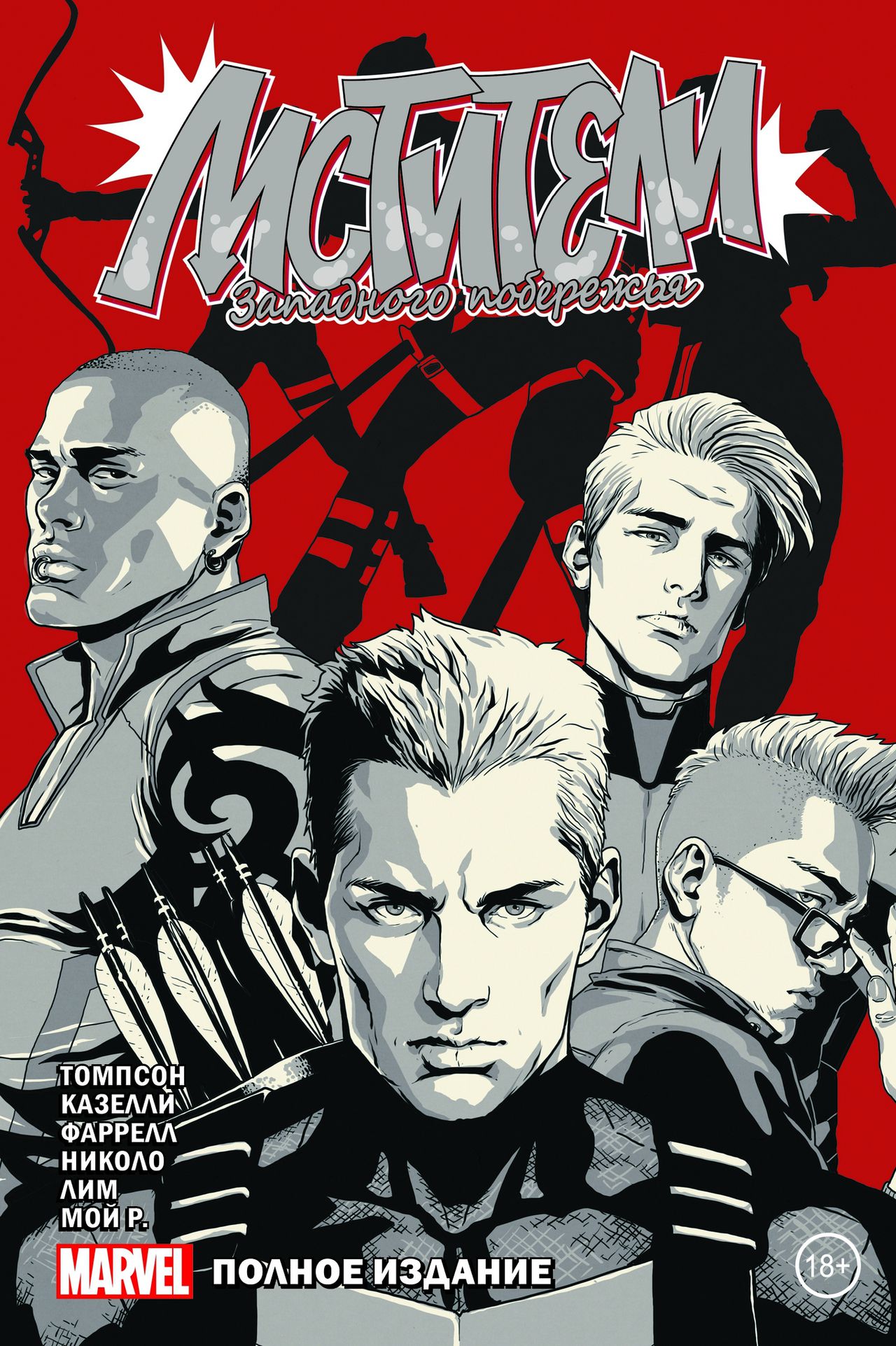 ГРЯДЁТ НОВАЯ ЭРА в истории величайших героев Тихоокеанского побережья! Встречайте: Хоукай (ваша любимая Кейт Бишоп!), второй Хоукай (Клинт Бартон!), Америка Чавес, Кид Омега (Квентин Квайр!), Гвенпул (Гвендолин Пул!) и парень по прозвищу Сплав (кто?)! Всё верно: они — новые Мстители Западного побережья!