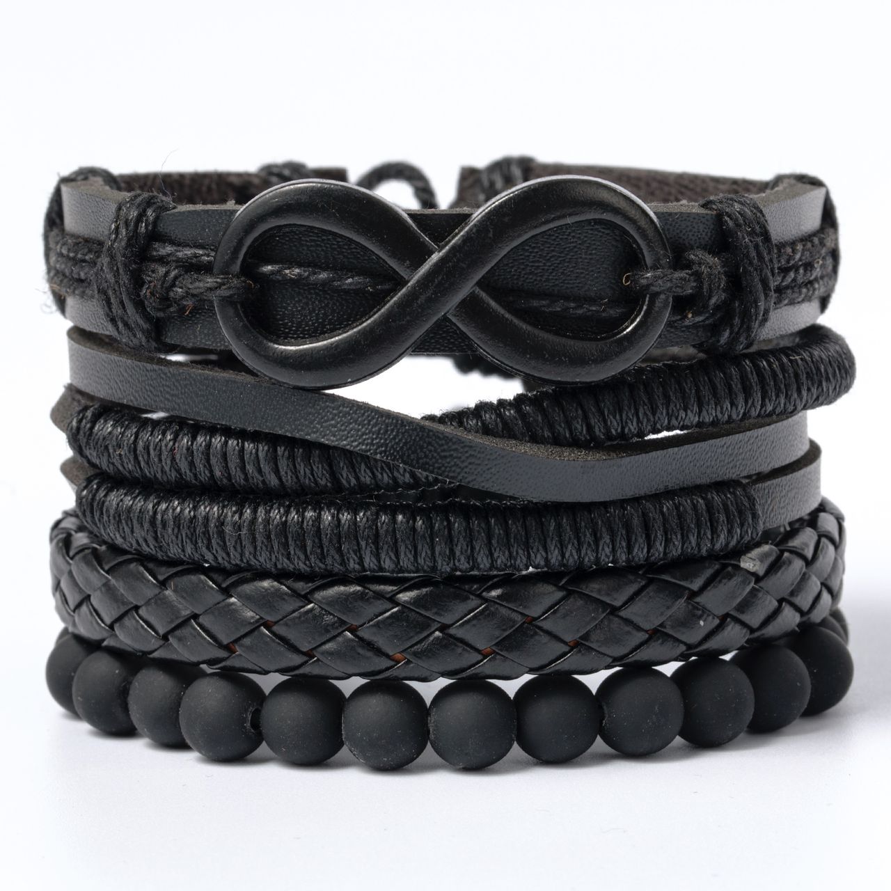 В наборе 4 браслета. Размер браслетов из искусственной кожи регулируется с помощью затяжек. Браслеты из деревянных бусин растягиваются за счет резинки.