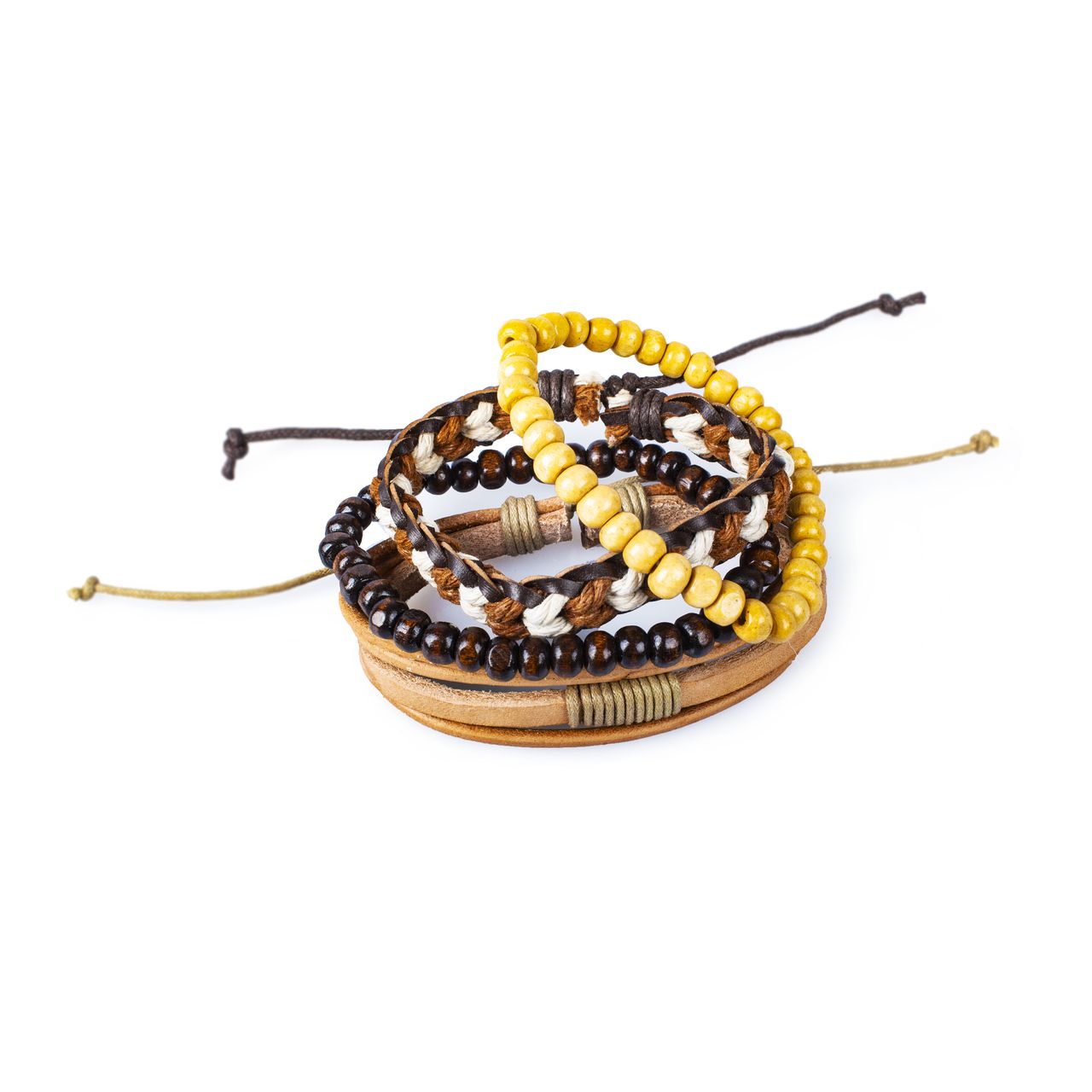 В наборе 4 браслета. Размер браслетов из искусственной кожи регулируется с помощью затяжек. Браслеты из деревянных бусин растягивается за счет резинки.