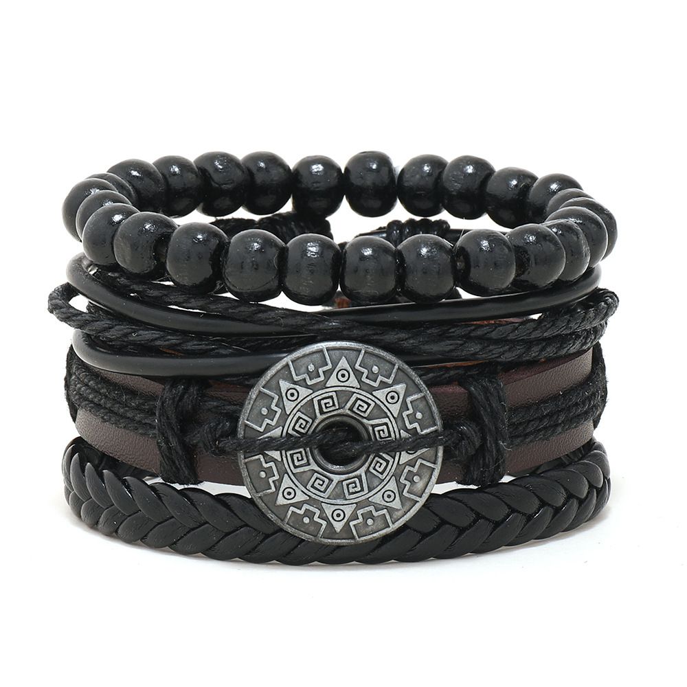 В наборе 4 браслета. Размер браслетов из искусственной кожи регулируется с помощью затяжек. Браслеты из деревянных бусин растягиваются за счет резинки.