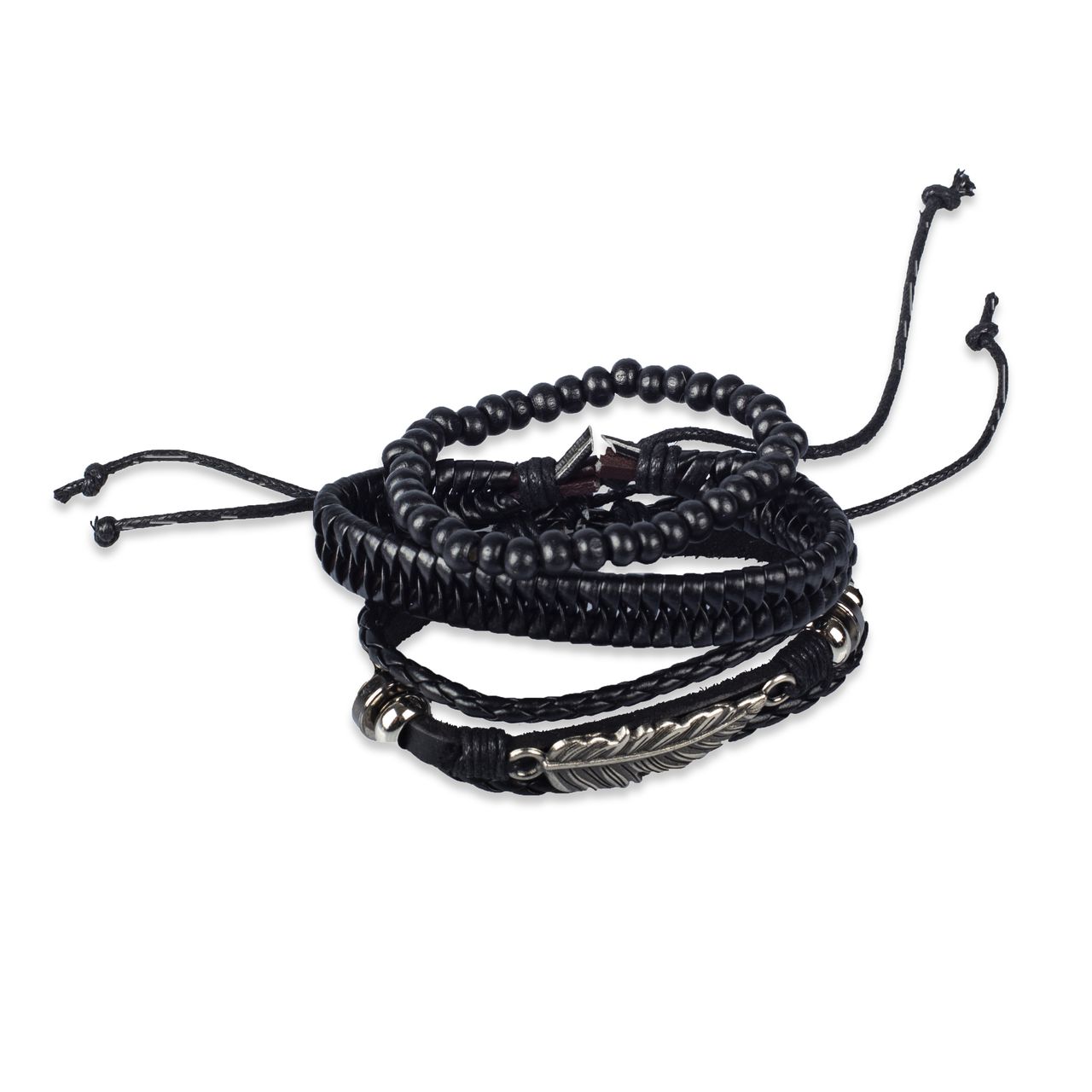 В наборе 3 браслета. Размер браслетов из искусственной кожи регулируется с помощью затяжек. Браслет из деревянных бусин растягивается за счет резинки.