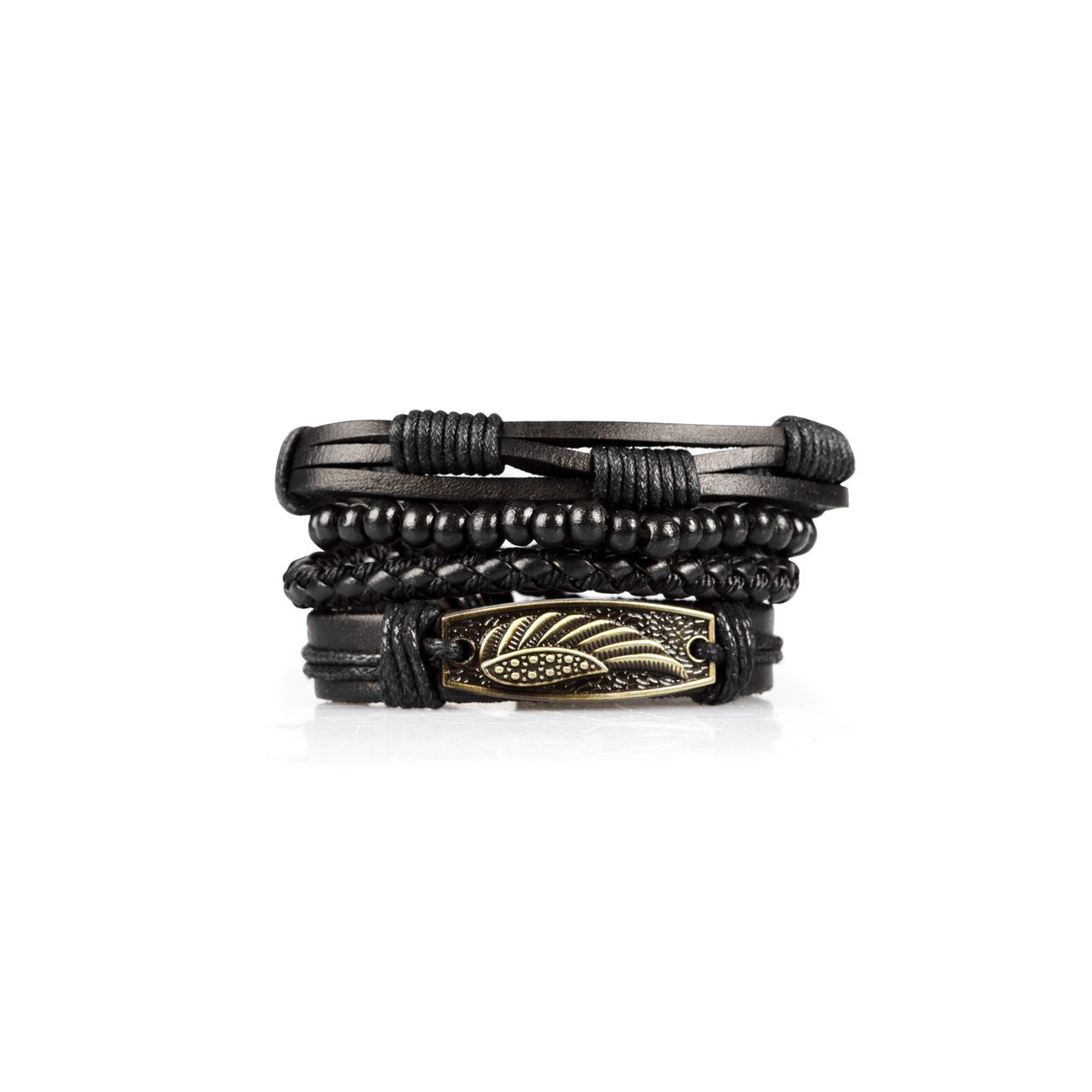 В наборе 4 браслета. Размер браслетов из искусственной кожи регулируется с помощью затяжек. Браслет из деревянных бусин растягивается за счет резинки.