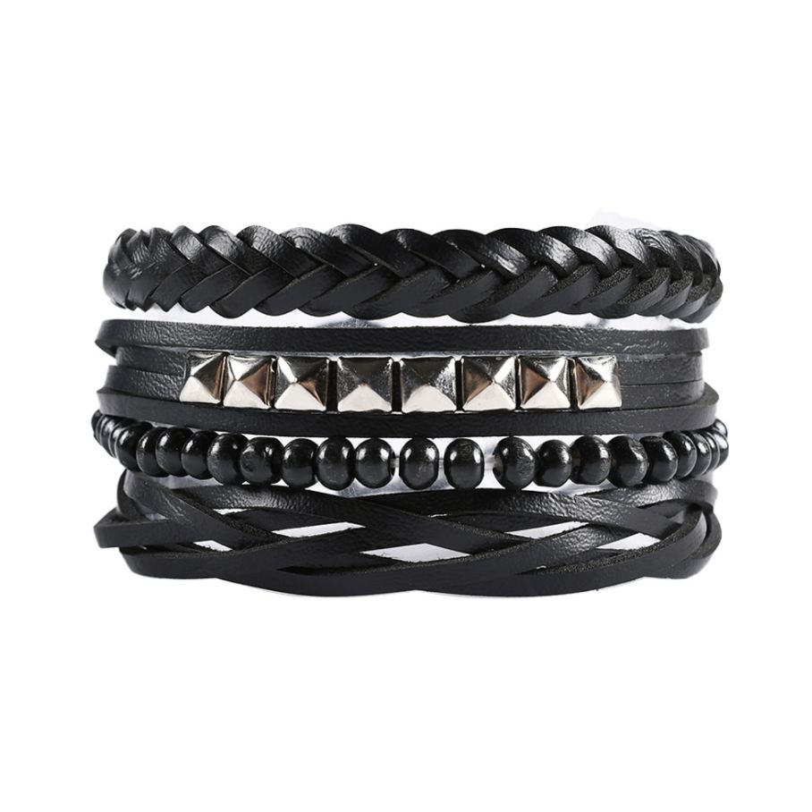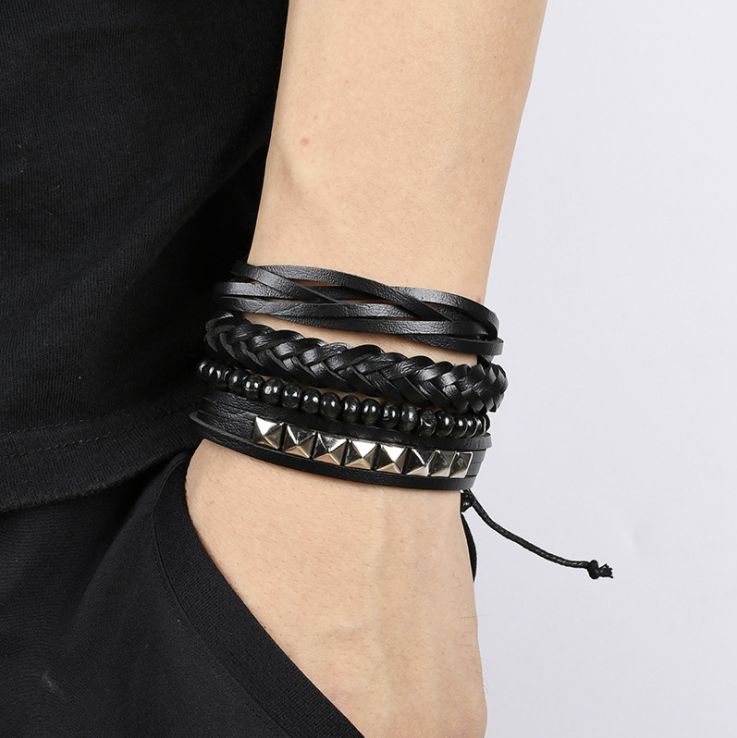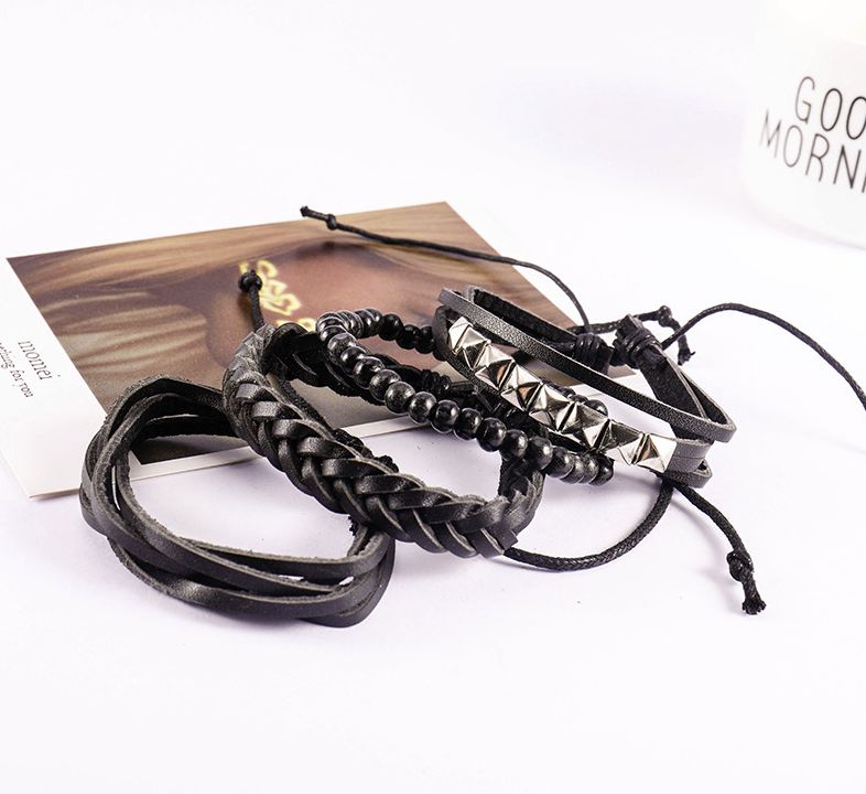 В наборе 4 браслета. Размер браслетов из искусственной кожи регулируется с помощью затяжек. Браслеты из деревянных бусин растягивается за счет резинки.