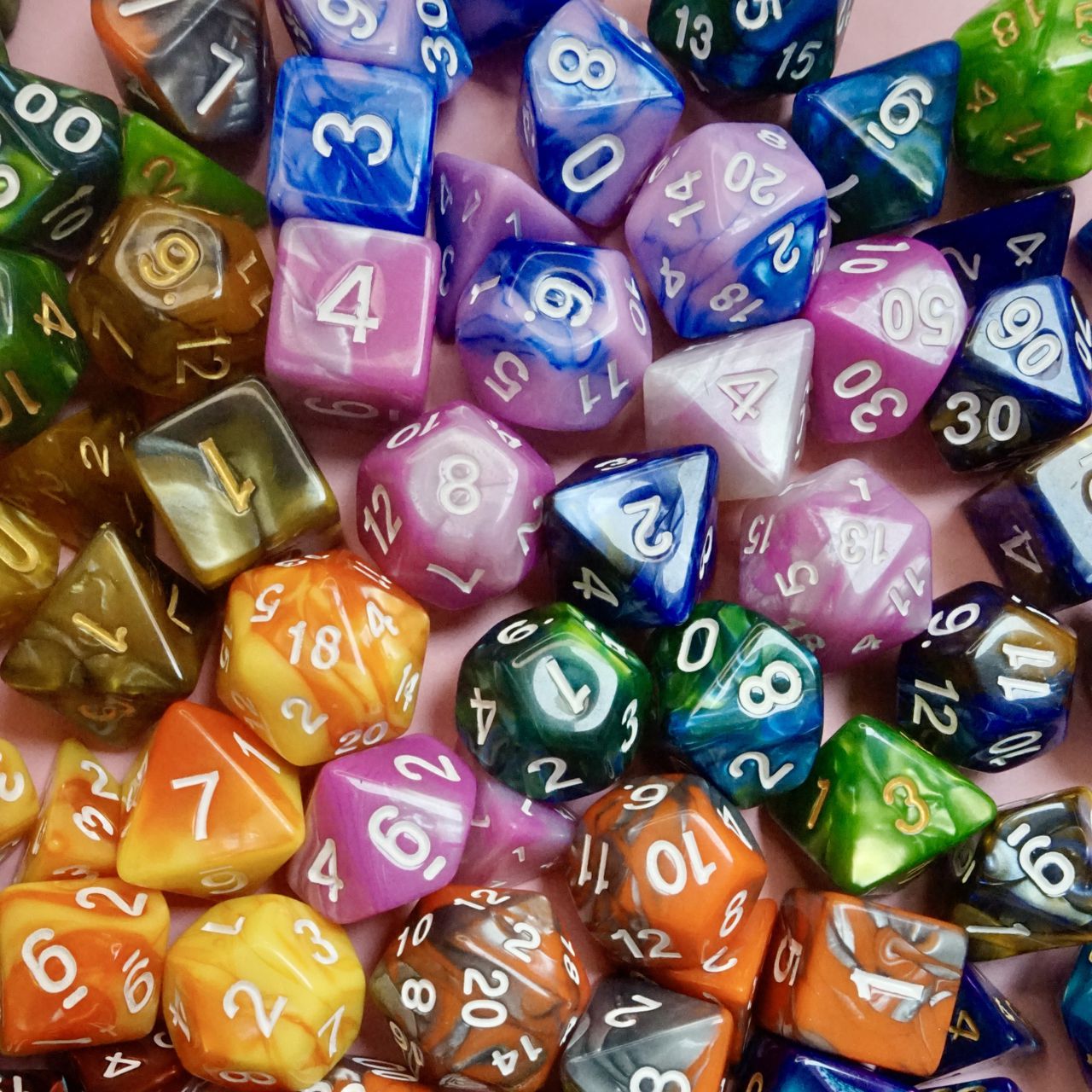 Наборы кубиков для ролевых игр решают проблему покупки необходимых дайсов. В наборе содержатся семь кубиков: D4, D6, D8, D10, D10 маркированных десятками, D12 и D20. Поставляются кубики в мешочке, который удобно брать с собой на игру, ведь он легко помещается в карман.