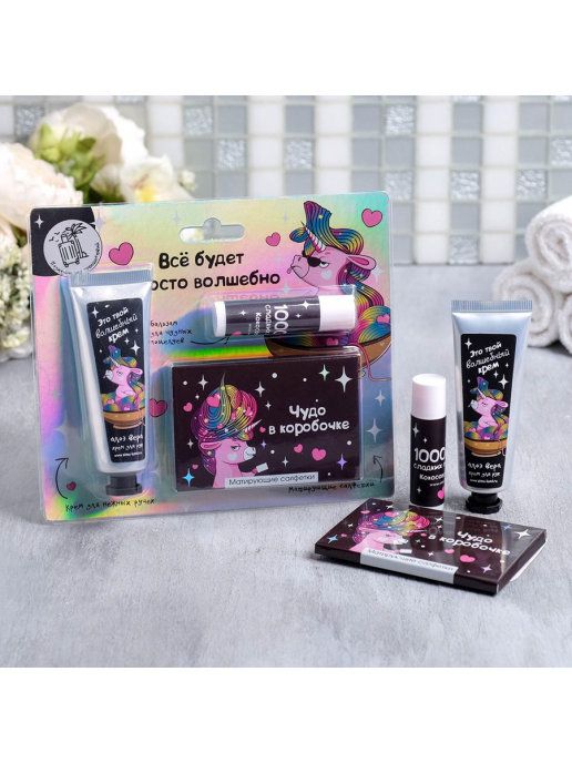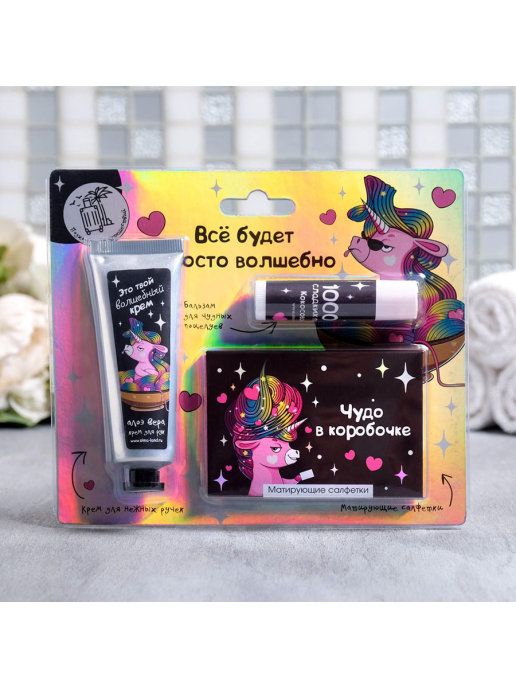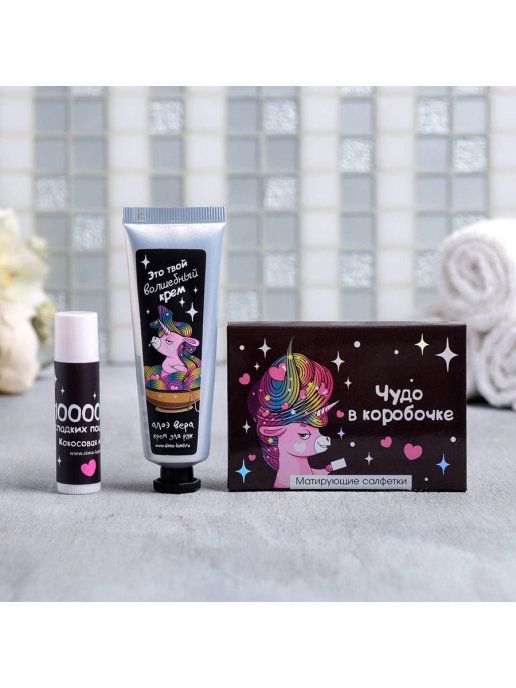 Такой набор очень удобно брать с собой! В набор входят: бальзам для губ, матирующие салфетки, крем для рук :)