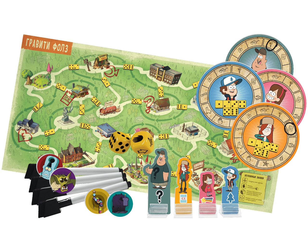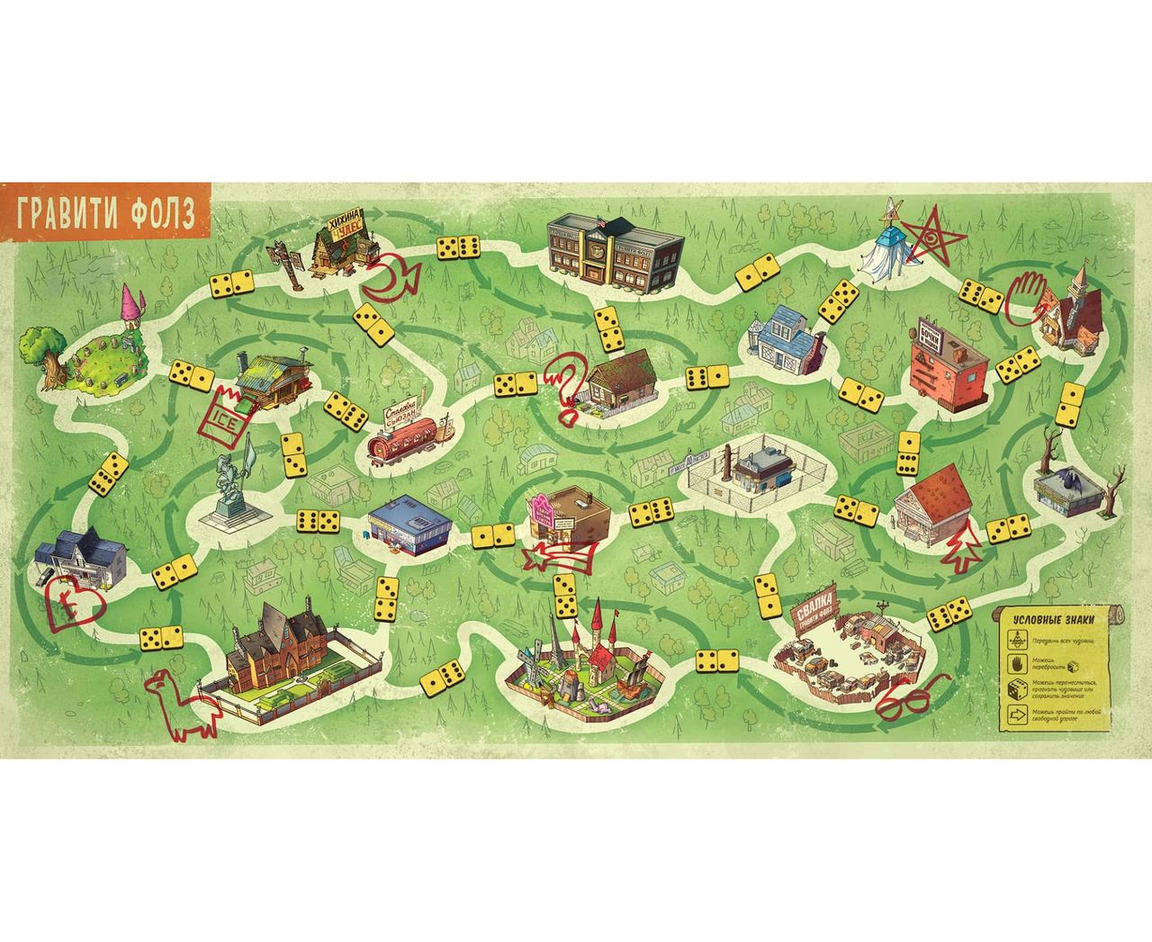 Цель игры – собрать символы всех персонажей. У каждого игрока есть планшет его героя, на котором он обводит маркером полученные символы. Символ самого героя уже обведён, поэтому для победы достаточно найти девять оставшихся символов. На игровом поле изображена карта Гравити Фолз с местами и дорогами, которые их соединяют. В некоторых местах можно найти символы, в других – встретить чудовищ.