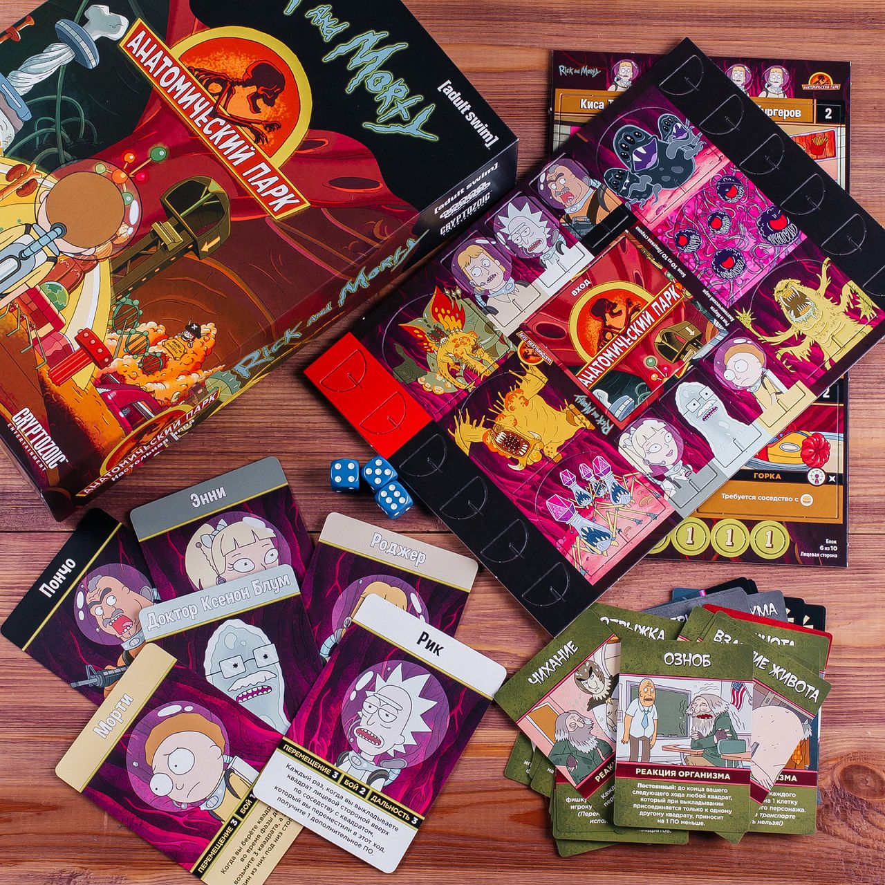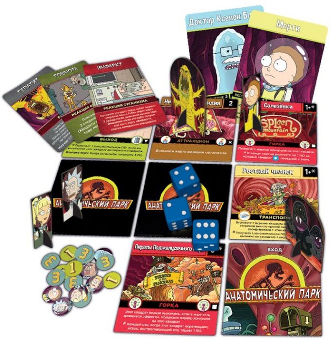"Рик и Морти: Анатомический парк" – настолько же безумная стратегическая настольная игра, насколько безумен и Рик Санчез! Игра создана по мотивам "s1e3" мультсериала "Рик и Морти", в котором Рик решил построить парк аттракционов в теле бездомного Рубена, но теперь эта задача ляжет на плечи игроков. Конечно, внутри всё расположено не слишком удобно для парка, поэтому игрокам предстоит двигать внутренние органы, планировать застройку, а также бороться с реакциями организма и болезнями. И лучше не медлить, арендодатель из Рубена не очень, его в любой момент инфаркт хватит!