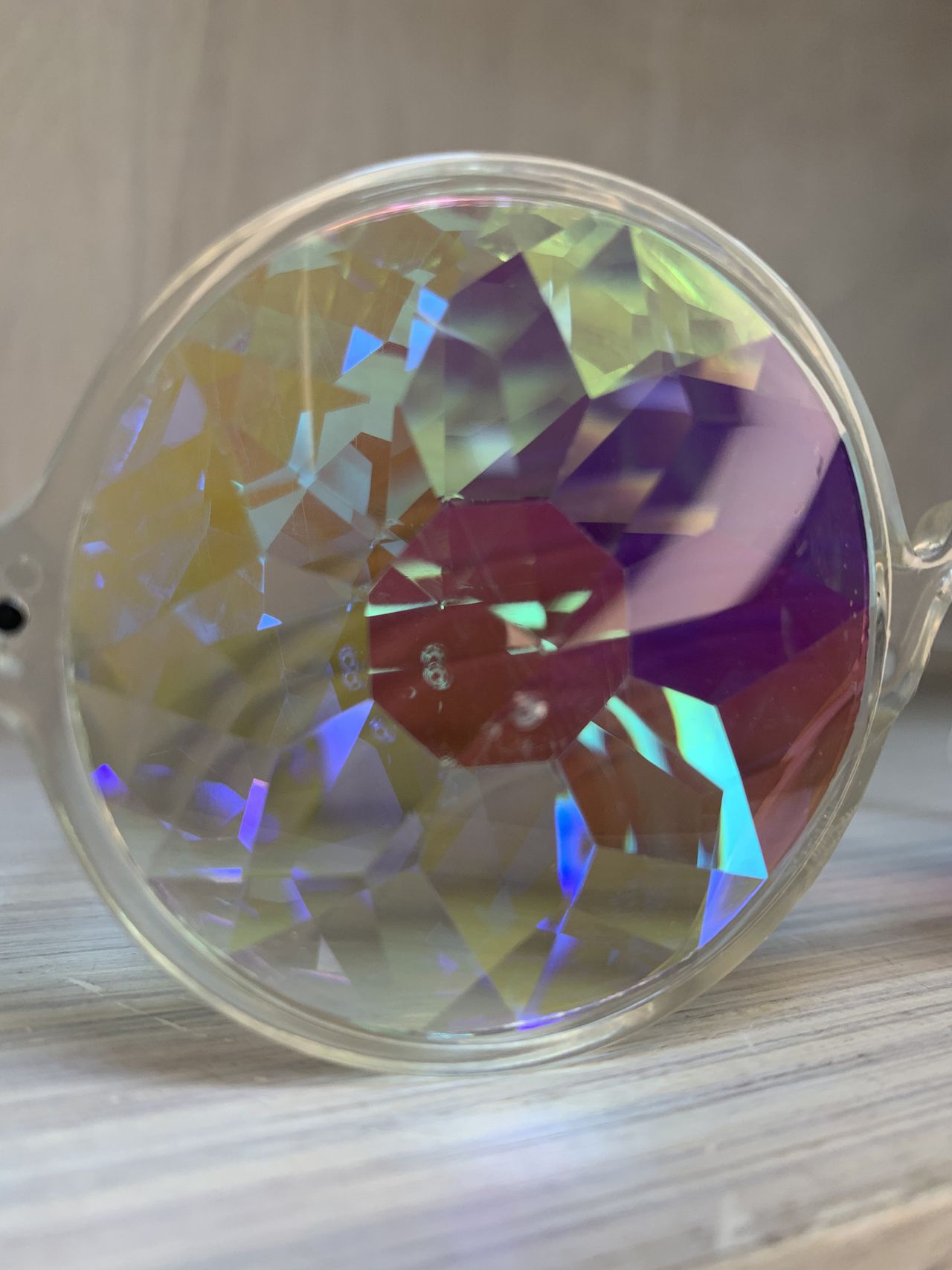 Очки калейдоскоп позволят создать необычный образ и привлекут к вам внимание. Столь необычный аксессуар поднимет настроение в пасмурный день и вызовет улыбки на лицах прохожих. Линзы очков выполнены из стекла, оправа же выполнена из пластика.