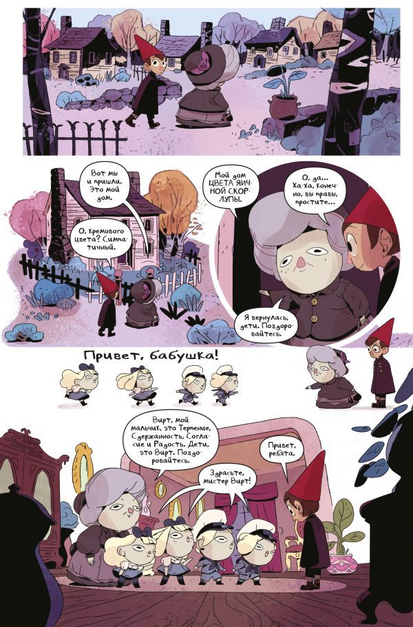 Грег теряет свой ботинок в суете приключений, и Вирту приходится думать, как же его заменить, да притом быстро! Ведь никто не хочет повторения летнего происшествия с занозой. К счастью, вскоре они набредают на Город-в-Лощине – деревушку, населённую деревянными куклами. Там Вирт встречает миссис Милосердие и устраивается к ней на работу нянькой, чтобы заплатить за новые ботинки. Однако чем больше времени герои проводят в этом городе, тем понятнее становится, что он хранит зловещую тайну. Анимационный мини-сериал и лауреат премии "Эмми" "По ту сторону изгороди" получает своё продолжение в этой истории. Писательница Силия Ловенталь (Storyteller: Fairies Джима Хенсона) и художник Хорхе Монлонго ("Время приключений") поведут вас в новое приключение вместе с Виртом, Грегом и Беатрис.