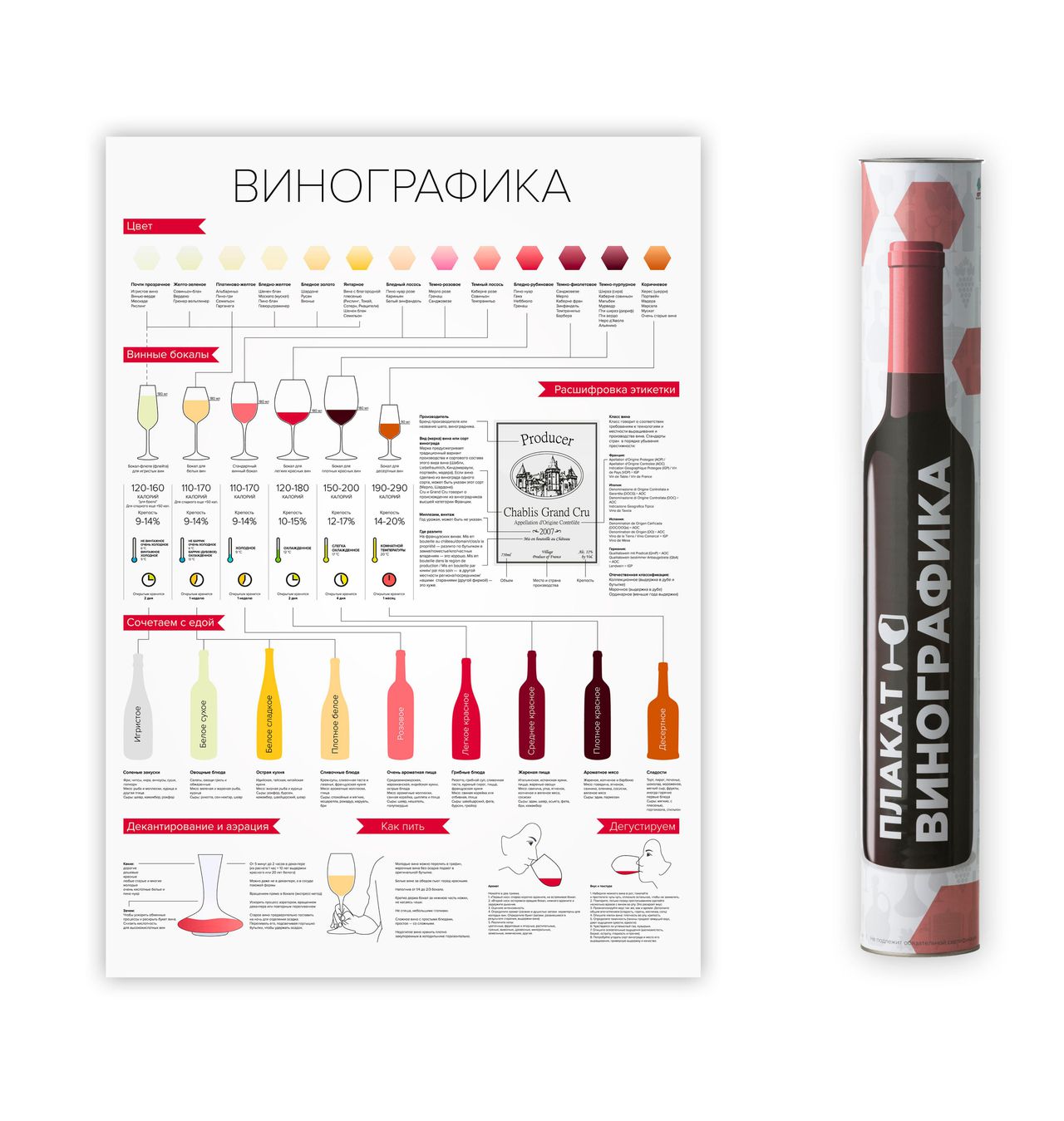 Вино - древнейший напиток. Мы не знаем, действительно ли истина содержится в вине. Но мы точно знаем, что распитие вина – это целая культура, и предлагаем вам купить Винографику – идеальный гид, который раскроет вам все винные секреты. Этот удобный постер форматом А2 поможет вам стать истинным энофилом – ценителем и знатоком «солнечного напитка», и каждая новая вечеринка в вашем доме будет проходить за дегустацией Шардоне, Пино Нуар, Рислинга, Мерло и других благородных напитков.