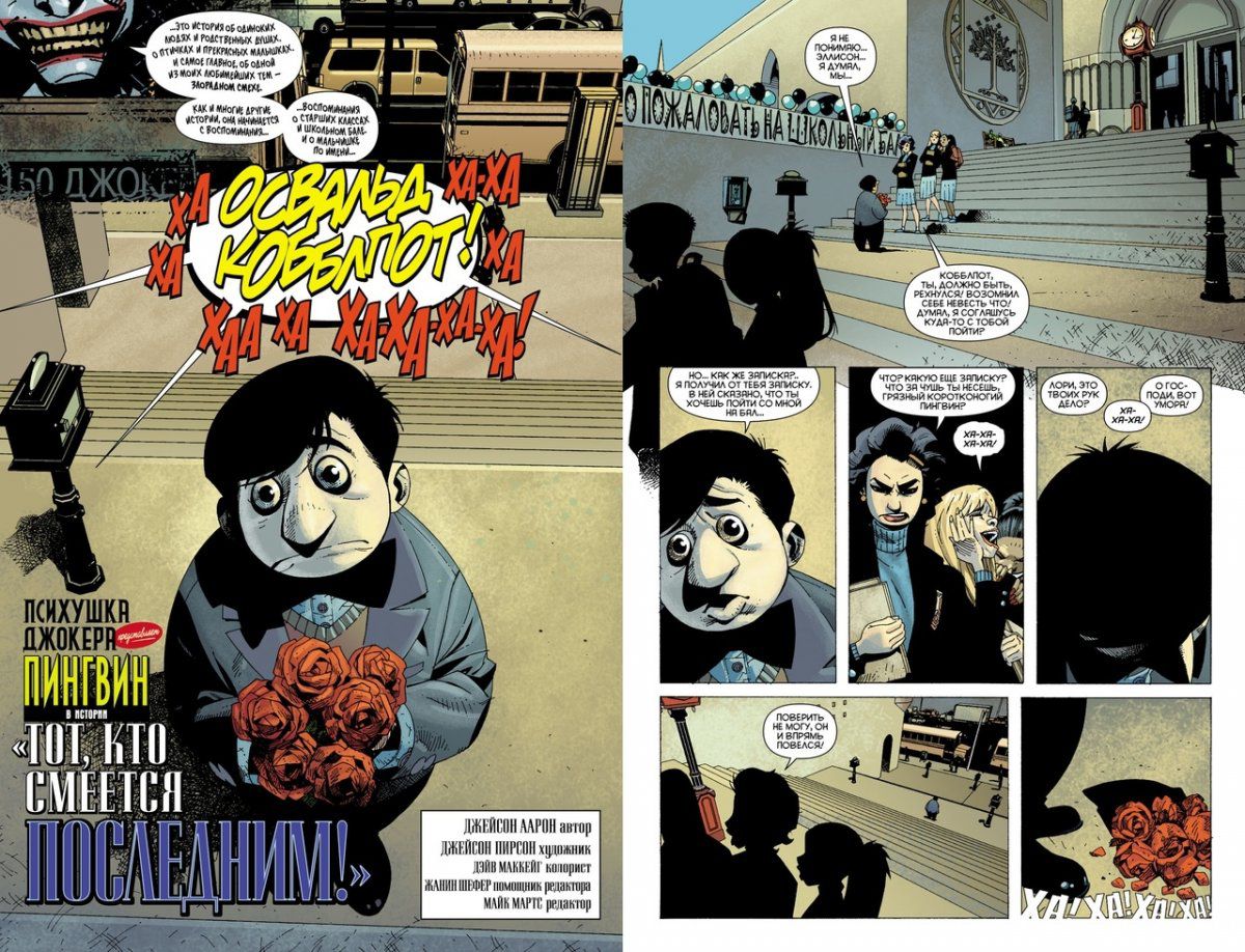 С детства над несуразно выглядящим Освальдом Кобблпотом насмехались люди. Никому это не сошло с рук. Увлекшись местью, Пингвин стал забывать о том, каково это – быть человеком, заботиться о ком-то, хотеть с кем-то быть вместе. Однажды, в минуту душевных терзаний, Пингвин спас девушку Вайолет. Он привязался к ней, а она не смеялась над ним из-за внешности и была добра. Им хорошо вместе. Сможет ли Пингвин простить миру обиды и стать просто Освальдом? Или пути назад нет и он должен всегда оставаться тем, кто смеется последним? Джокер точно знает, как все было. И как будет…