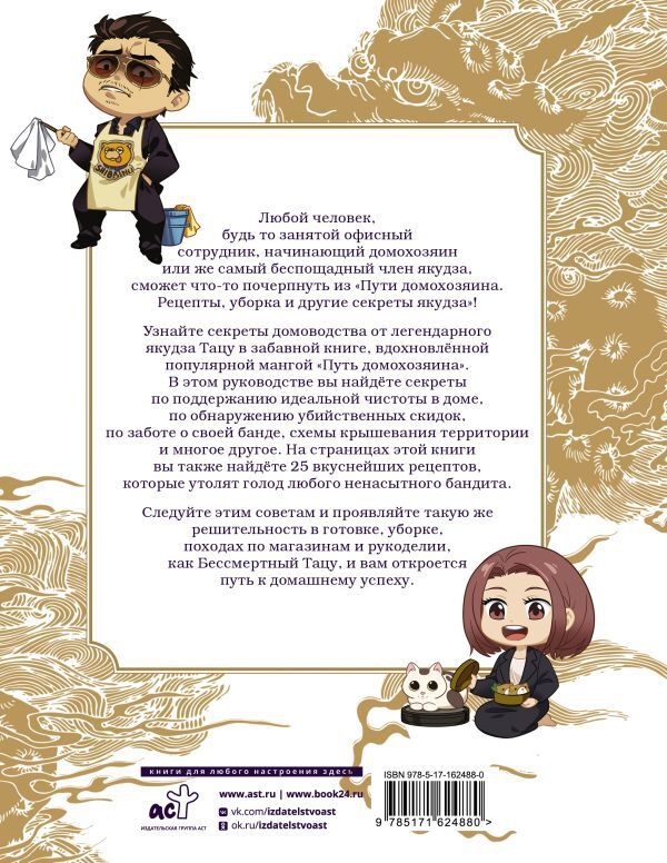 Узнайте секреты домоводства от легендарного якудза Тацу в забавной книге, вдохновлённой популярной мангой «Путь домохозяина». В этом руководстве вы найдёте секреты по поддержанию идеальной чистоты в доме, по обнаружению убийственных скидок, по заботе о своей банде, схемы крышевания территории и многое другое. На страницах этой книгивы также найдёте 25 вкуснейших рецептов, которые утолят голод любого ненасытного бандита.
