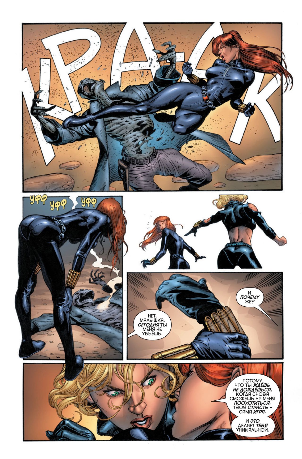 Война вдов! Наташа Романова всегда вела жизнь, полную приключений. Бывшая советская шпионка, она переметнулась на сторону Запада и стала супергероиней и Мстителем. У Наташи репутация непревзойдённого профессионала: уравновешенного, рационального и смертельно опасного, как паук, что дал ей имя. Но сейчас, возможно, её время в качестве Чёрной Вдовы подходит к концу! Елена Белова — первая ученица в истории Красной Комнаты, превзошедшая Наташу, и теперь она жаждет славы, которую, по её мнению, у неё украли. И она намерена вырыть для соперницы могилу! Готовьтесь к бою посреди пустынь Среднего Востока и Верхнего Вест-Сайда в Нью-Йорке. А также узнайте историю "бледного паучка" в рассказе о московских приключениях Беловой! Не одна, а целых две Чёрных вдовы! Не одна, а целых три истории под одной обложкой! И это не просто рассказы о бездумной раздаче тумаков, а самые настоящие шпионские и детективные истории! Сначала Романова и Белова схлестнутся в схватке на новое биологическое оружие, затем одна украдёт жизнь другой, а в конце вас ждут приключения Чёрной вдовы на самом дне Москвы, где ей придётся искать убийцу своего наставника вместе с работниками МУР. Отдельно стоит обратить внимание на рисунок, за каждую историю отвечает свой художник, очень разные, но отлично справляющиеся с задачей передать темп и настроение повестования!
