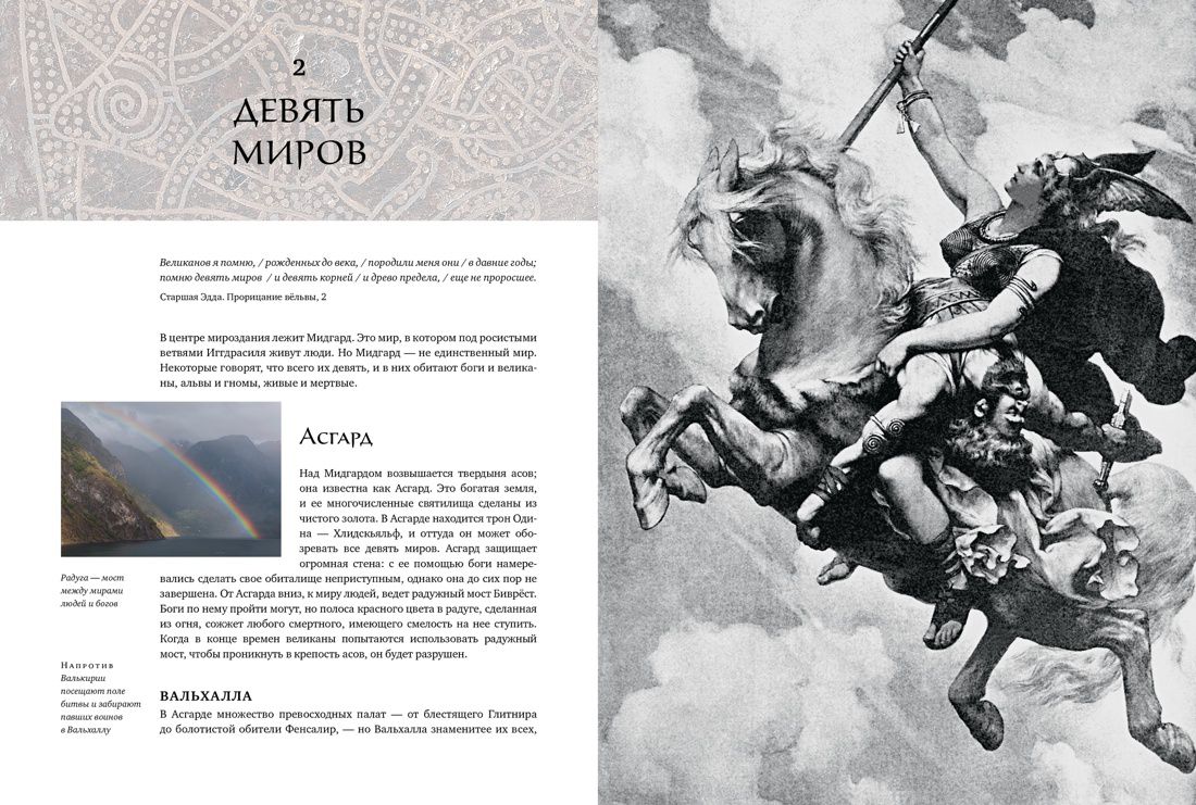 - «Эта книга повествует об одном из самых интересных корпусов текстов Средневековья: о богатой мифологии, давшей нам Тора и одноглазого Одина, страстную Фрейю и воинственных валькирий, инеистых великанов, гномов-кузнецов и загадочных альвов, а также смутное предчувствие Рагнарёка. Во многом скандинавские мифы сохранились благодаря неожиданно рано развившейся письменной культуре средневековой Исландии. Тот факт, что до нас дошло так много материала не только о скандинавских богах и богинях, но также и о легендарных героях и следовавших по их стопам викингах-первооткрывателях, — огромная удача.