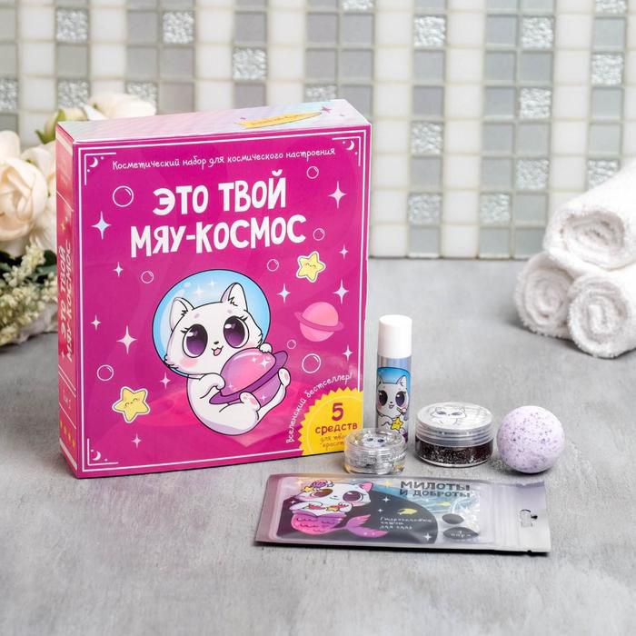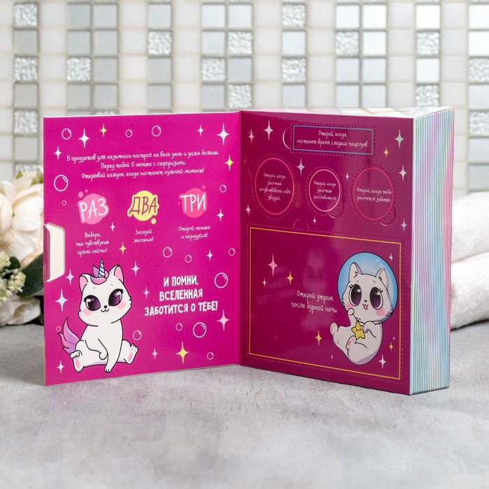 Набор случайных по аромату косметических средств! Внутри 5 окошек - тайничков, где можно найти: бальзам для губ, патчи под глаза с гиалуроновой кислотой, маска для лица, бомбочка для ванны, глиттер.