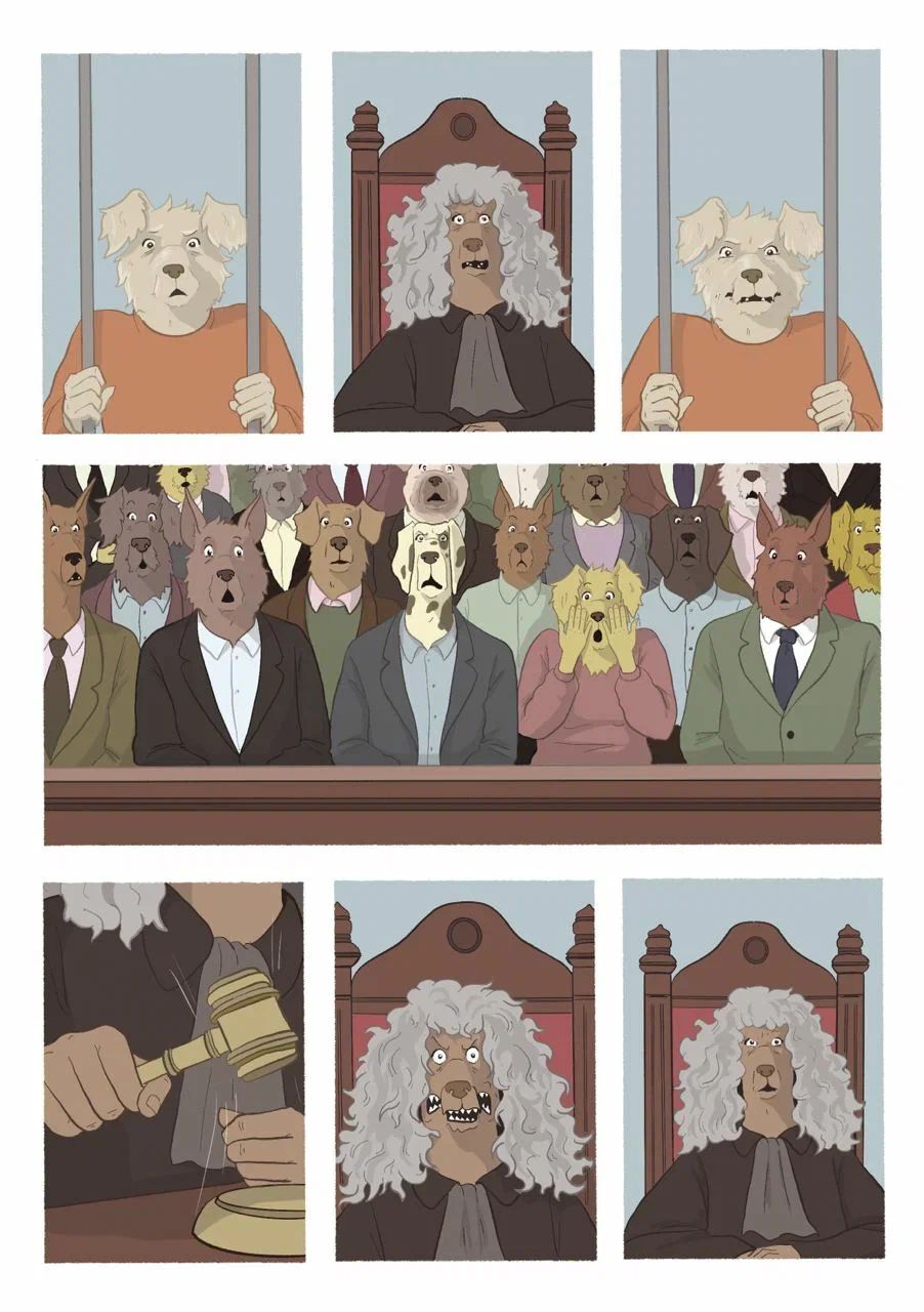 Процесс над пожилой мохнатой гражданкой длится уже несколько дней, но затягивается и становится всё абсурднее и абсурднее: частный суд в торговом центре, родственные связи должностных лиц и сомнительные морды вместо присяжных. Всем встать, пёсий суд идёт!