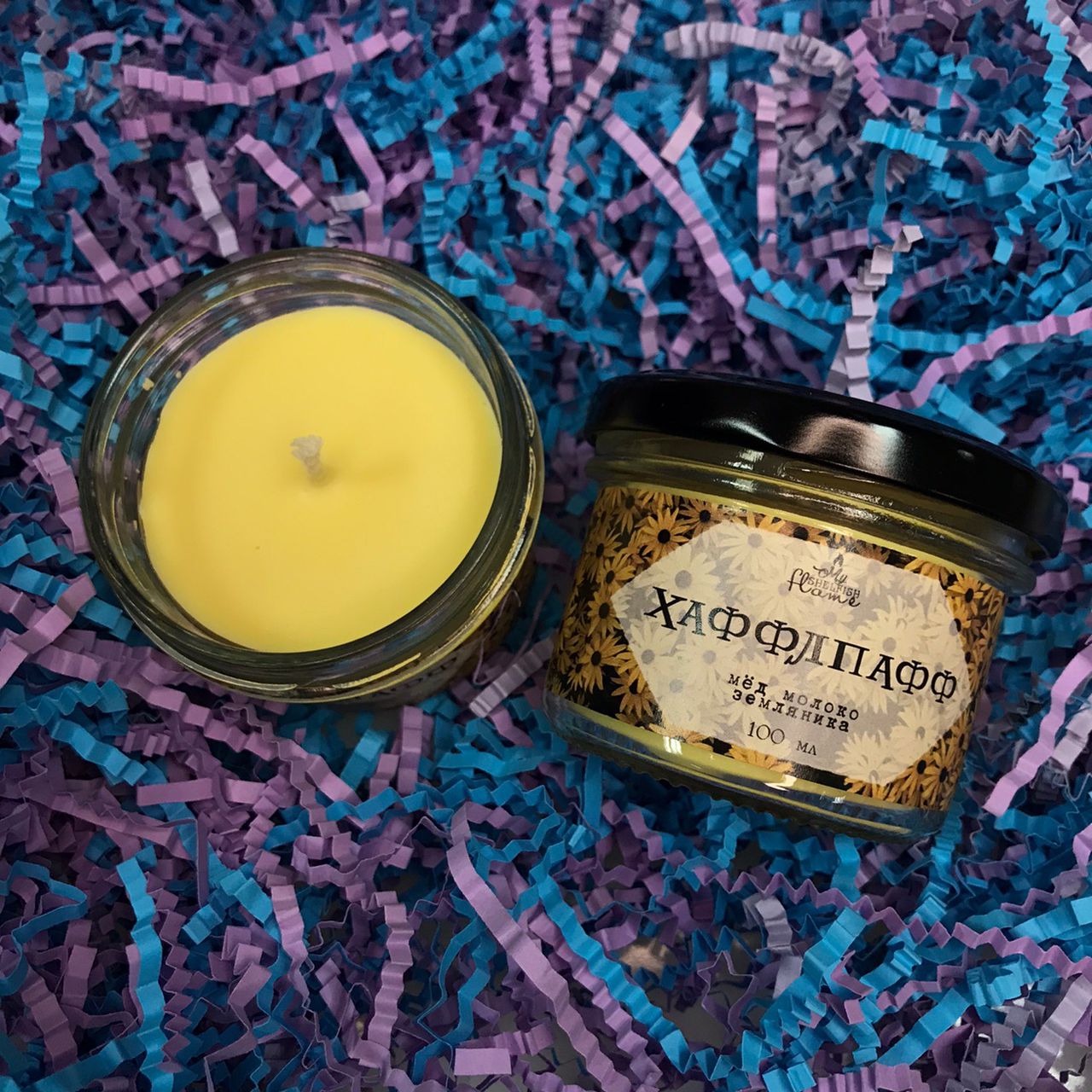 Для нас факультет Пуффендуй пахнет мёдом, молоком и земляникой, так же пахнет и эта свеча!