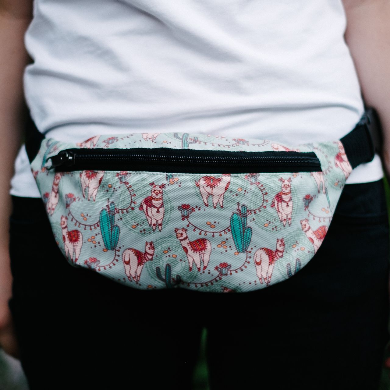 Летнии сумки на пояс с альпаками! Сумка выполнена из влагоотталкивающей ткани. У поясной сумки есть 2 кармана: один располагается спереди, другой — сзади.