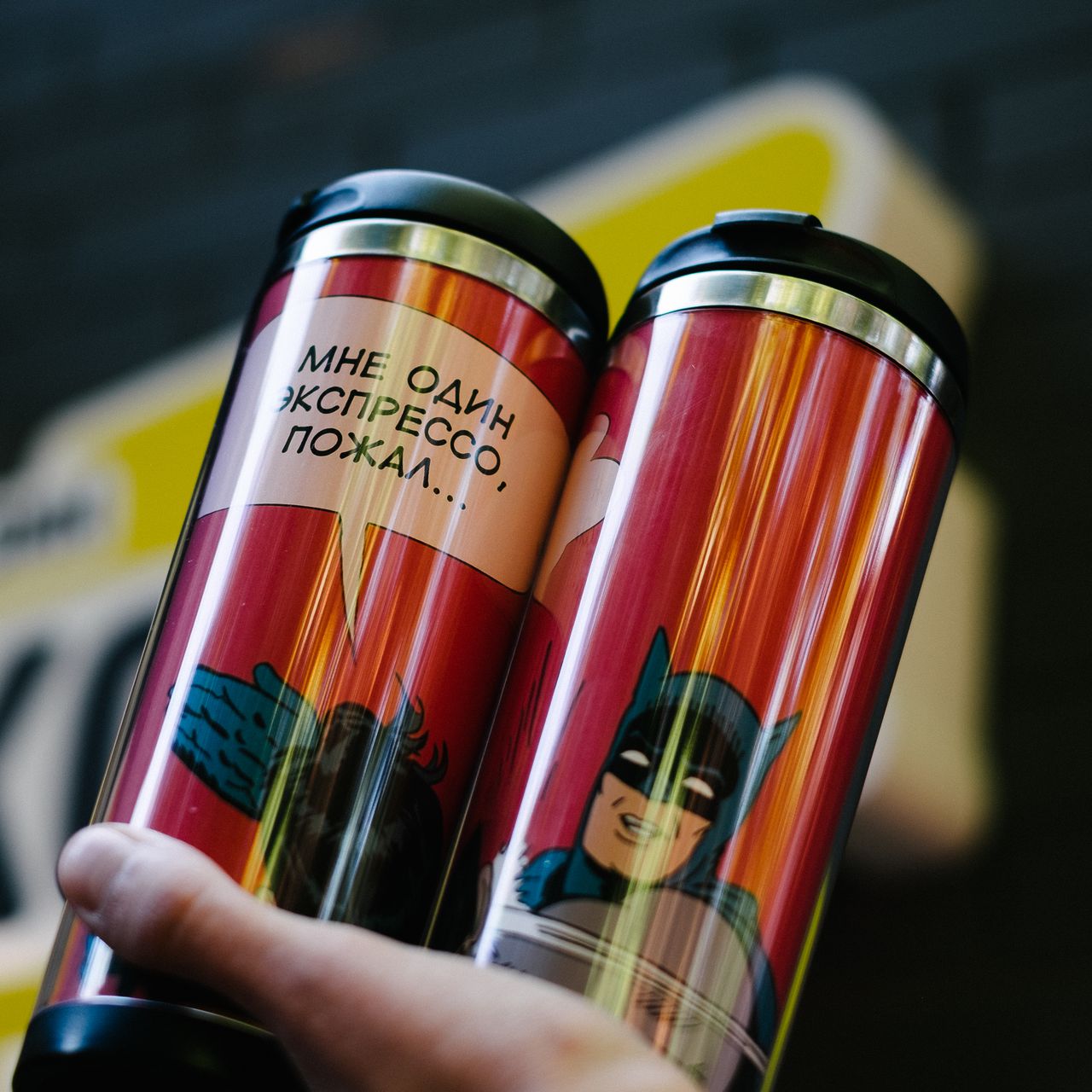 Термокружка Бэтмен и Робин для ценителей кофе и грамотной русской речи. Тамблер сохраняет тепло на протяжении 3-5 часов благодаря двойной стенке.