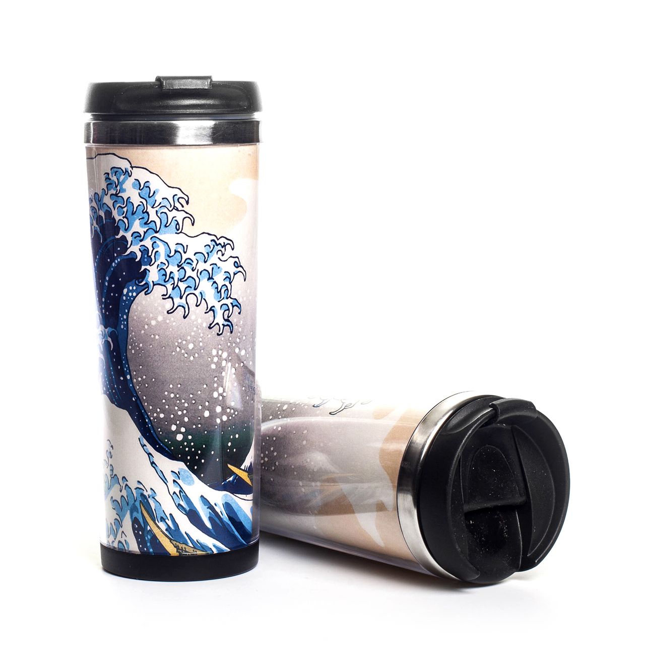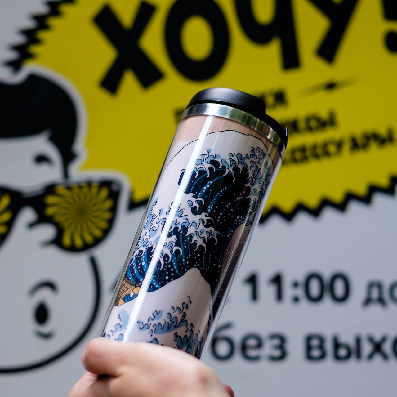 Термокружка с легендарной гравюрой японского художника Кацусики Хокусая. Тамблер сохраняет тепло на протяжении 3-5 часов благодаря двойной стенке.