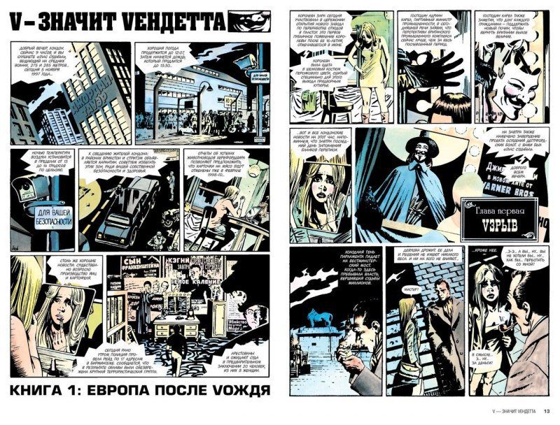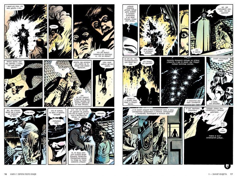 Книга «V – значит Vендетта (Абсолютное издание)» помимо культовой лимитированной серии комиксов Алана Мура, содержит в себе еще несколько десятков бонусных страниц с набросками, черно-белыми немыми сценами, и позволяет детально взглянуть на то, как создавался шедевр.