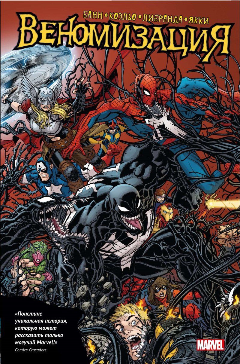 История «Вселенной Венома» подходит к эпическому завершению! Яды — существа, которые охотятся на симбиотов и их носителей с суперсилами, — выбрали следующую цель: сама Вселенная Marvel! Их первостепенная задача? Подсадить симбиота с Клинтара каждому сверхчеловеку, чтобы поглотить его! И пока Веном и Люди Икс не вернулись после событий «Poison X», Земля остаётся беззащитной! Когда команда возвращается домой, симбиоты уже привязаны к десяткам героев и злодеев. Яды поглоща- ют сильнейших, и уцелевшие союзники способны лишь сплотиться — и выступить против своих же! Но что яды запланировали для Клетуса Кэссиди, он же Карнаж? И может ли хоть что-то во всей Галактике преградить путь... Яду-Таносу? В сборник входит «Веномизация», № 1–5 от Каллена Банна, Ибана Коэльо, Кевина Либранды, Скотта Ханны, Ливси и Мэтта Якки.